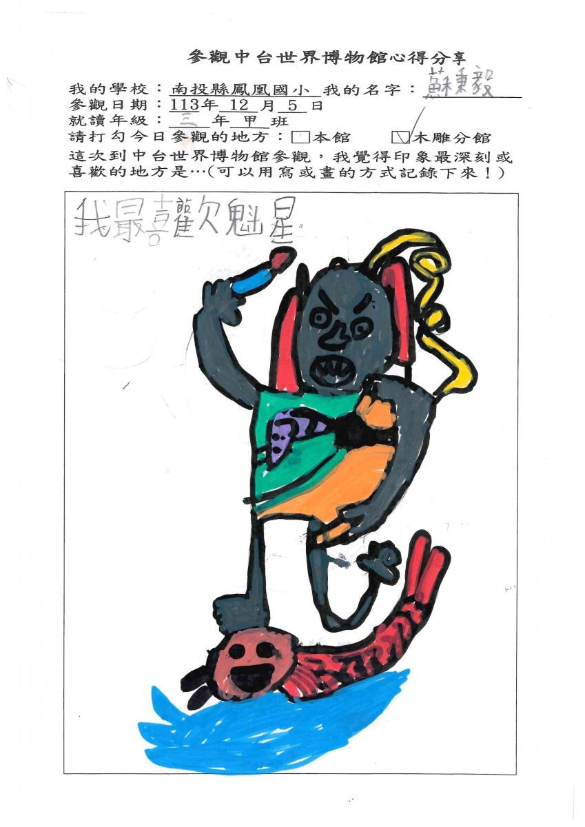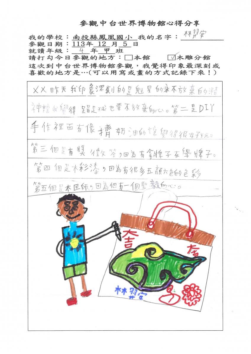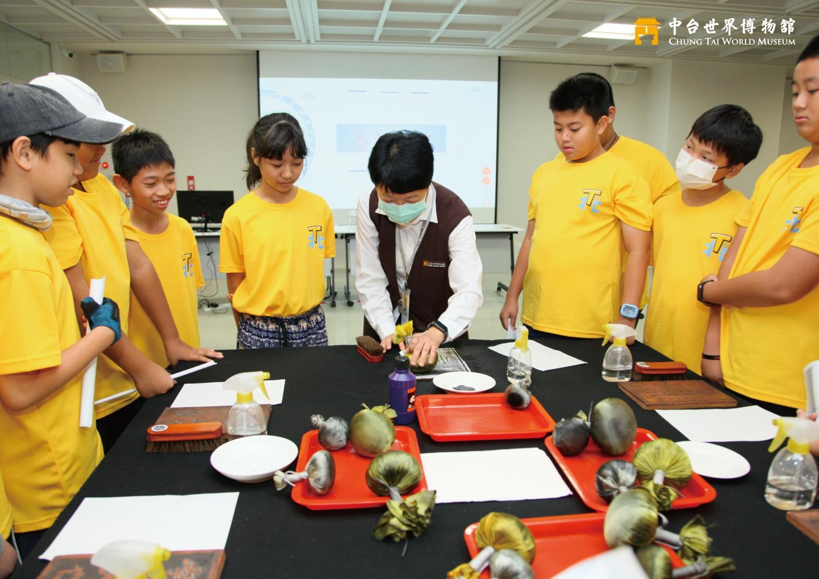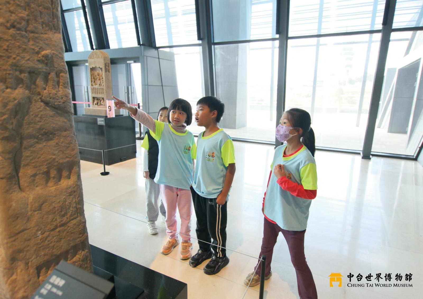 2024年12月12日,中台世界博物館迎來魚池鄉東光國小師生們的參訪。至此,本學期博物館已接待來自南投縣的鯉魚、北投、鳳凰、東光四所小學的參訪團體。自107學年度推行「南投縣國民小學校外教學補助方案」,提供遊覽車車資補助,以及免費參觀門票與導覽機租用,致力於實踐創館以來「藝術化世」的宗旨,成為南投縣小學生校外教學的重要回憶。        館內的校外教學義工團隊自107年起,不斷精進並更新教學內容,透過生動活潑的方式,將博物館兩個館舍的文物及其背後的故事帶入孩子們的生活之中。參訪本館的學生不僅能認識漢字書體的演變、近距離欣賞名家書法作品,還能細品造像碑上的精緻圖案,從中發現這些文物與日常生活的緊密聯繫;在木雕分館,學生不僅從木雕工藝中學習到專注堅持的職人精神,也透過繪本導讀與分享進一步認識博物館的內涵。