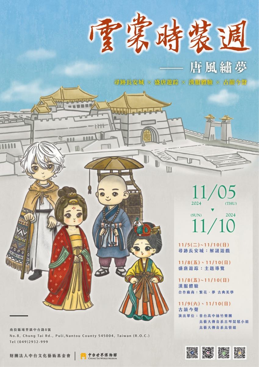 此外,延續去年時裝週活動中備受觀眾喜愛的主題導覽活動,11月8日由扮演唐代仕女的導覽員,帶來館藏時裝主題導覽。導覽員從自身的服飾解說帶到館藏展件的服裝細節。生動地介紹唐代服飾、審美標準及其背後的文化意涵。11月10日的館藏唐代人物主題導覽,導覽員從歷史上的名家字帖依序介紹到紀載著宗教、文化的碑文,觀眾透過深入淺出的講解,彷彿走進歷史場景中,一窺唐代社會風貌,並認識了唐代著名的書法名家、政治人物、貴族等。許多參與觀眾表示在有趣的解說下,對唐代文化有了更加具體的認識。