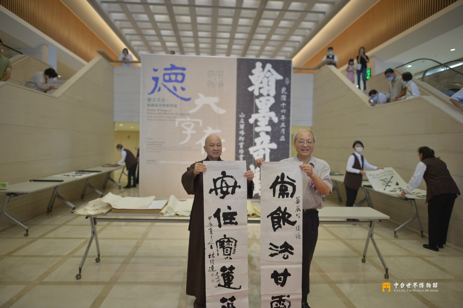 中台世界博物館於7月27日,迎來一場文化盛宴——「德大字在:館藏榜書藝術特展」的開幕儀式。這次活動邀請到南投縣文化局林榮森局長、知名書法家林隆達教授、南投縣書法學會理事長曾惠楨校長為特展開筆揮毫。並邀請到知名畫家蔡友教授、府城謙受堂主人康益源先生、暨南大學中文系系主任陳美蘭教授、暨南大學中文系陶玉璞教授、南投縣美術學會榮譽理事長許民盛老師、埔里鎮立圖書館許雅婷館長、典藏古美術藍玉琦總編、暨大附中國文科江衍聲主任、南光國小林取德校長……等,眾多書法愛好者、文化藝術界人士及在地教育人士和媒體親自蒞臨開幕儀式,使活動現場氣氛十分熱烈、歡欣。