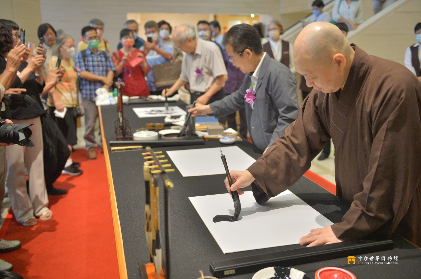 此次開幕儀式特別設計兩個環節,讓觀眾充分感受到書法藝術的魅力。首先邀請林榮森局長、林隆達教授和曾惠楨老師三位書法名家於現場揮毫。林榮森局長為特展分別寫下隨緣順勢、所願皆成,祝福所有與會貴賓;林隆達教授書寫「般若」、「常飲法甘露,安住寶蓮華」等佛教偈語,表達自身在親近佛法與書法創作中得以清淨的感悟;曾惠楨教授則寫下「禪」、「無為知足」、「無一物」等作品,描述對生活的感念。三位書法名家在書寫大字時,各自展現出沉穩、蒼勁、靈活地筆勢與心境。