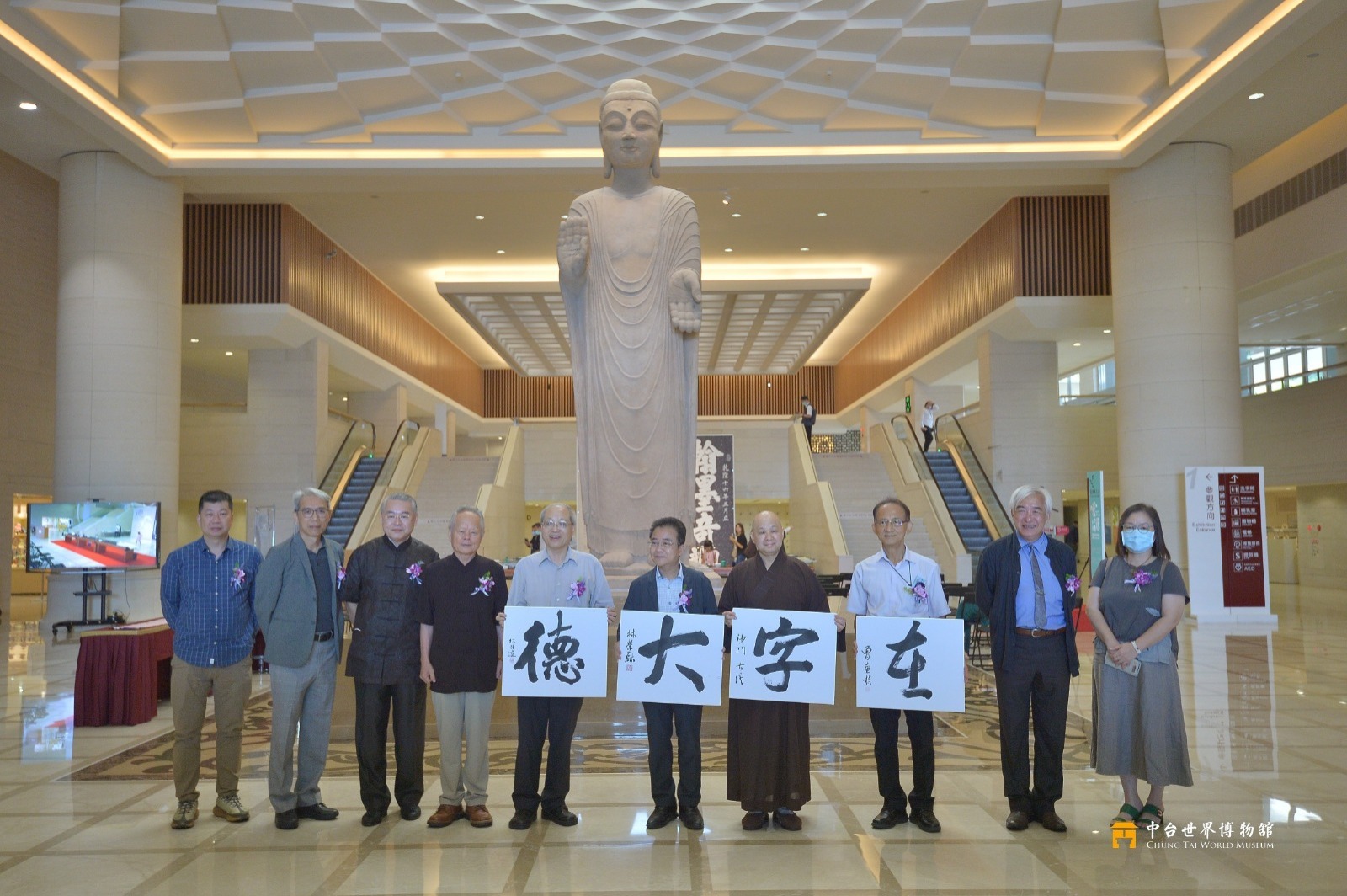 「德大字在」特展精選了西安碑林和府城謙受堂贈藏的石碑拓本,包括北朝山東佛教摩崖「大空王佛」原石拓本、西安碑林的「翰墨奇觀」及「寧靜致遠」等巨型碑刻作品。這些作品不僅富含文化意義,更展示了書法藝術的磅礡氣勢。南投縣文化局林榮森局長也藉此向大家分享自身書寫書法的心得及大字書寫的不易,並讚賞此次特展的殊勝。南投縣書法學會理事長曾惠楨校長亦分享自身臨摹古今字帖的心得,並讚嘆中台世界博物館保留許多難得的碑刻文物,讓如今的書法愛好者們也能得以一見這些好字。謙受堂的康益源先生,更有感於自身與博物館的因緣,藉由今日開幕儀式,再次致贈本館一幅摩崖大字「安樂佛」拓片,拓片高達2米,字體宏大、莊嚴,大氣非凡!而在這次特展開幕前遇颱風襲台,陰雨連綿多日,館長也在開幕致詞中引用清代孫星衍的聯句──「莫放春秋佳日過,最難風雨故人來。」表達能與貴賓、朋友們在雨後天晴的好時光中相逢,並感謝所有與會貴賓的蒞臨。