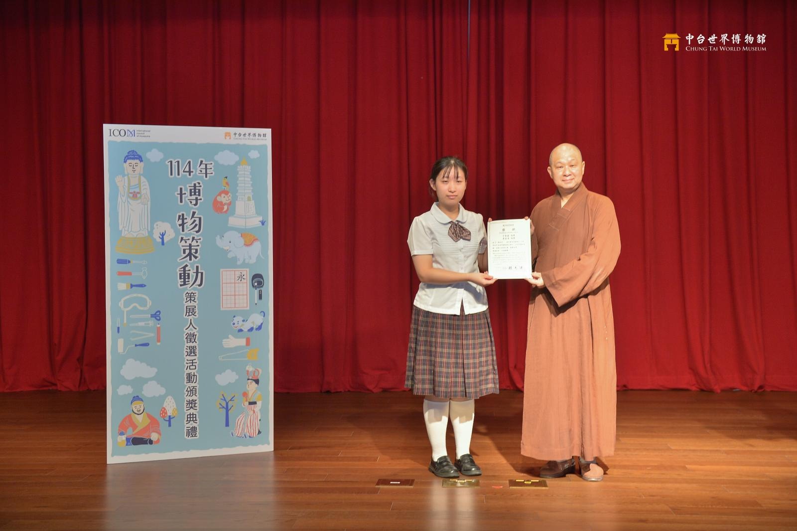 5月18日,中台世界博物館於重閣講堂舉行博物策動頒獎典禮。館長見諶法師在致詞時表示,國際博物館日是全球性的文化節日,鼓勵大家透過各種形式參與文化。而策展,正是一種讓博物館與社會、文化、觀眾產生連結的方式。學生從發想、考據、設計到主題轉譯,完成一次難得的策展體驗;也勉勵學生獎項只是形式,不論有無得獎,都是成長的一部分,持續努力才是關鍵。