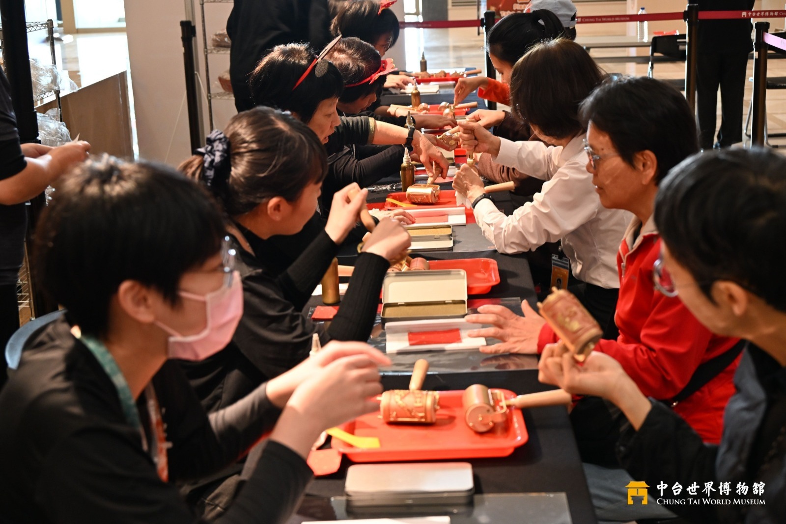 本次滾筒印章 DIY 活動以善財童子、馬年意象及博物館元素為設計主題,規劃三款新春專屬圖像。在工作人員細心指導下,觀眾將油墨均勻塗佈於滾筒印章表面,過程看似簡單,卻需要專注與耐心。當圖像逐漸清晰呈現時,現場不時傳來驚喜與讚嘆聲,大小朋友皆沉浸於創作的樂趣之中。完成作品後,參與者即可將承載祝福的茶包帶回家,讓新春喜氣透過茶香傳遞,也使藝術自然融入生活。