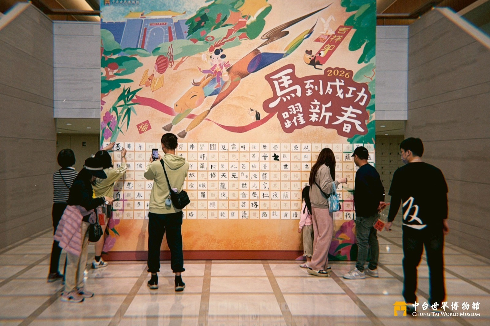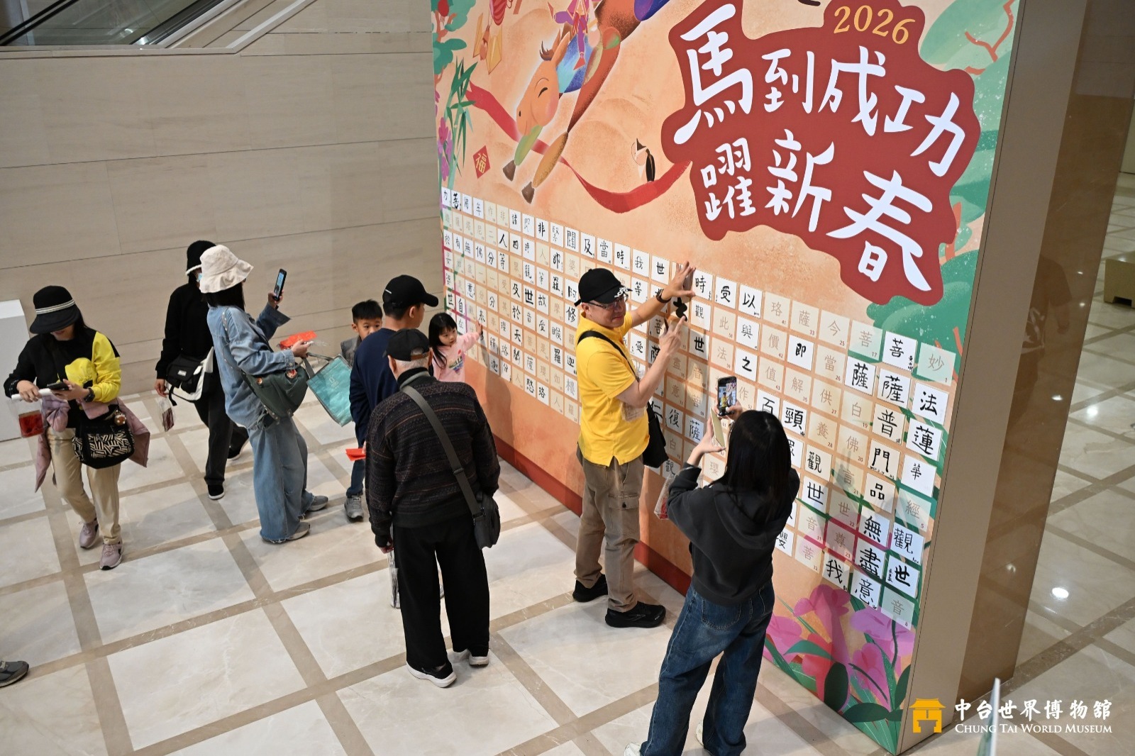 博物館今年於新春期間推出「馬到成功躍新春」系列活動,以歡樂喜氣的節慶氛圍迎接新年到來,透過多元文化體驗內容,讓觀眾在走春參觀的同時,也能感受藝術與文化的魅力。其中承襲往年深受觀眾喜愛的「舞筆迎新──萬眾集字祈福」活動,邀請入館觀眾一人書寫一字,共同完成 207 字節錄〈妙法蓮華經觀世音菩薩普門品〉,透過眾人書寫匯聚心願,為新的一年祈福;同時辦理的「滾滾好運迎春來──滾筒印章 DIY」活動,則結合藝術與生活美學,讓觀眾親手將祝福印製於茶包之上,將滿滿心意帶回家與親友分享。