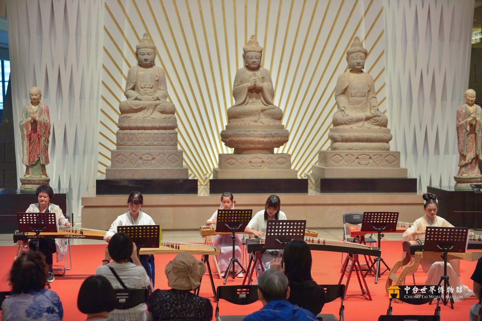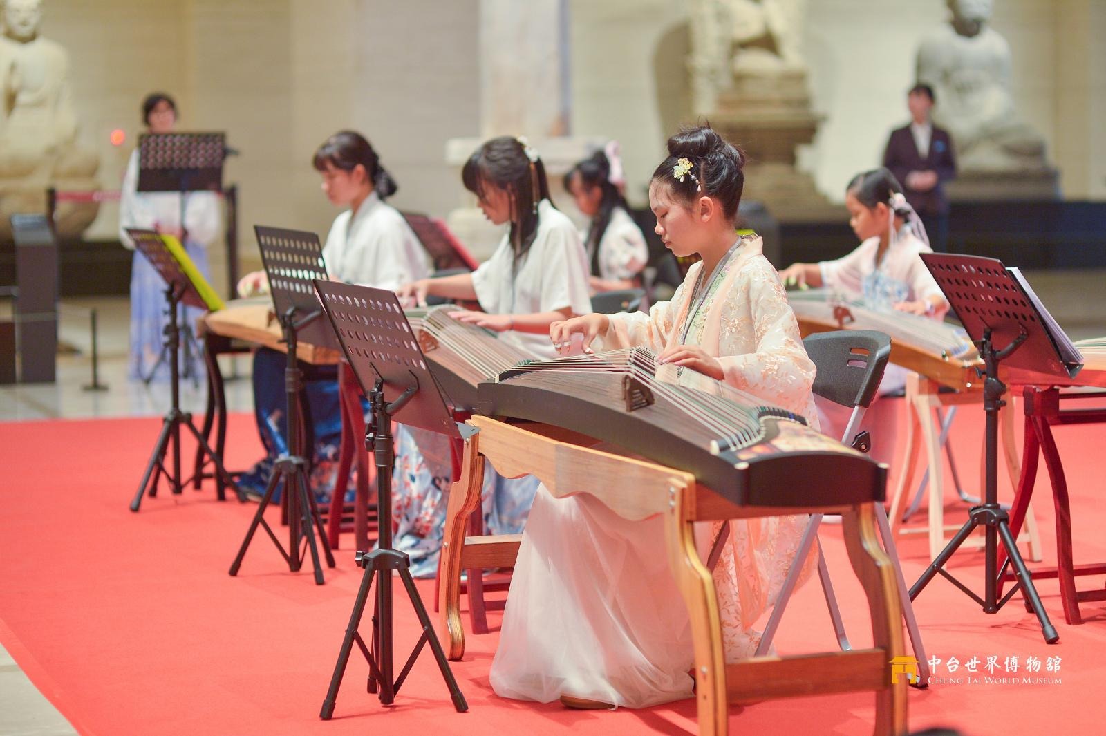 11月8日,博物館特別邀請鄭旭娟老師與其學生帶來古箏演出。演出曲目包括〈笑傲江湖〉、〈小毛驢〉、〈新鴛鴦蝴蝶夢〉等。悠揚箏音在展廳中流轉,旋律時而婉轉細膩,時而激昂澎湃,吸引許多觀眾駐足欣賞,沉醉於古韻悠長的樂音之中。 11月9日,則由「薪傳舞蹈團」帶來兩支舞作。第一支舞〈飛花蝶語〉以蝴蝶為靈感,舞者以輕盈的身姿描繪出花間起舞的夢幻景象;第二支舞〈裂蓮〉則展現「動與靜」的張力,舞者以蓮花破泥而出的姿態,展現生命的韌性與綻放的力量。舞者們以優雅的律動與深情的演繹,帶領觀眾穿越時空,感受萬象風華的絢麗與靜謐。