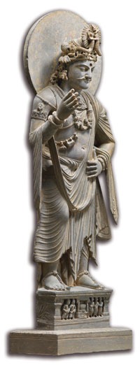 此菩薩立像帶有古希臘羅馬青年俊朗的輪廓神采,華貴酷似印歐混血的風度翩翩王子,與巴基斯坦犍陀羅地區夏巴茲加里(Shāhbāz-Garhī)寺院出土,一至三世紀片岩雕刻,現藏於法國巴黎居美亞洲藝術博物館的「菩薩立像」(圖二),有異曲同工之妙。嚴飾瓔珞的華彩流光,細膩華美的敷巾冠飾,巍巍威儀的俊雅姿態,高貴豪華的殊妙服飾,流露王侯貴族的王子氣派,無疑是悉達多太子成佛前菩薩裝扮的完美體現。