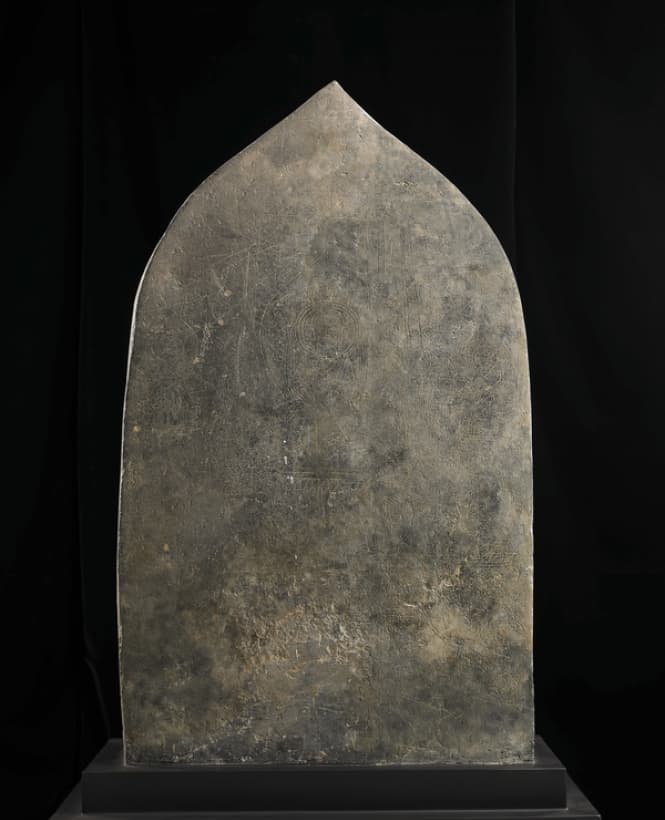 此鋪背屏式高浮雕三尊像。主尊螺旋紋高髪髻,面相清秀,微含笑意。身著褒衣博帶式袈裟,內有僧祇支,中間結帶,手施無畏、與願印,跣足立於蓮台之上。二脅侍菩薩頂戴寶冠,寶繒垂肩,衣著帔帛,左右各持蓮苞、淨瓶及桃形鎖,瓔珞帛帶在腹前結成 X 形。此尊造像之背屏式一鋪三身像具體呈現出山東青州地區的造像風格,既雄偉磅礡又細密入微。