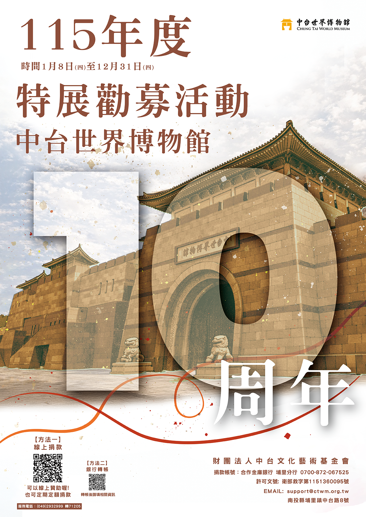 財團法人中台文化藝術基金會捐款帳號:合作金庫銀行 埔里分行 0700-872-067525