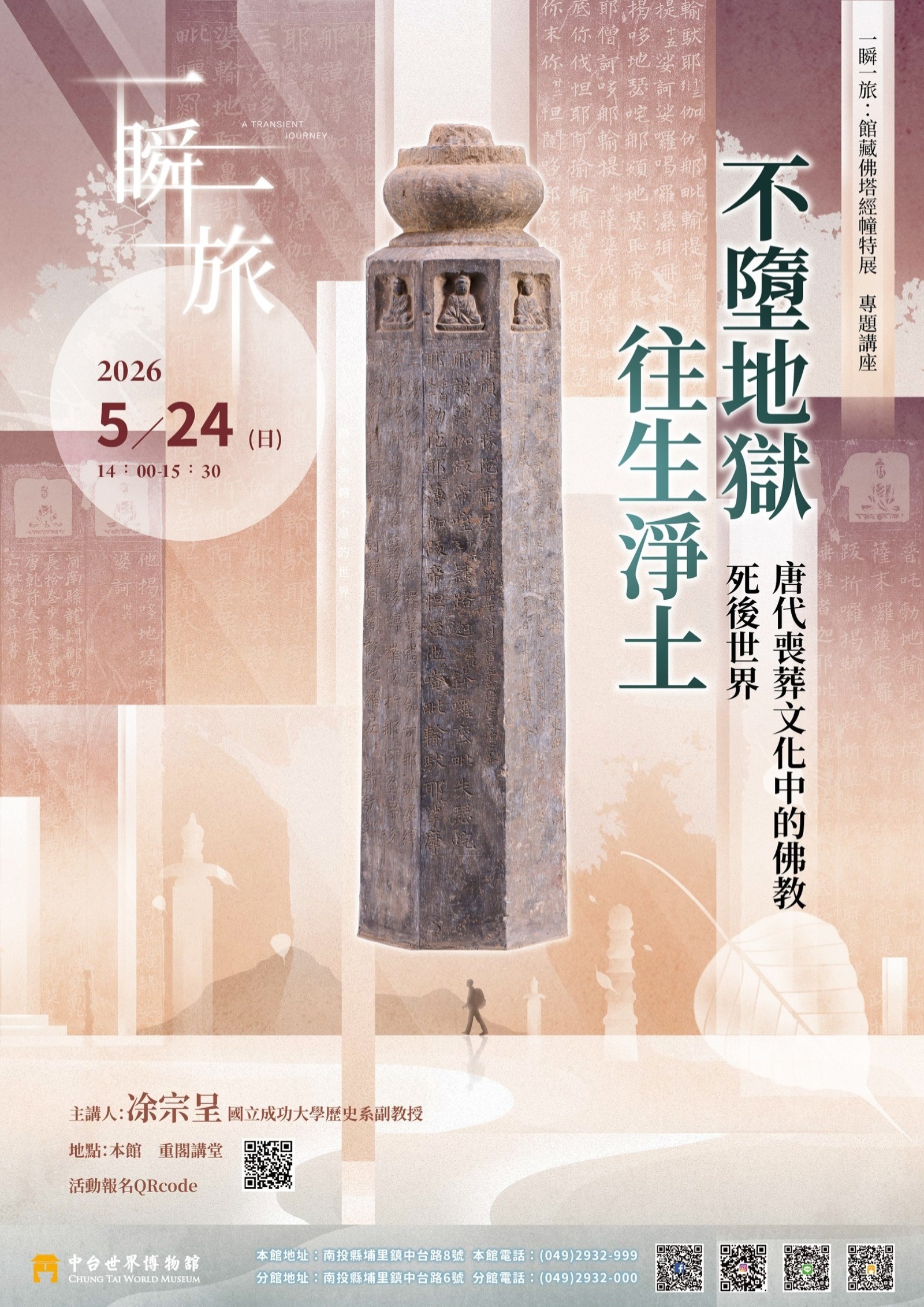 佛教傳入並流行於中國之後,不僅改變了宗教信仰的面貌,也深刻影響了人們對死亡與來世的想像。本次講座特別邀請國立成功大學歷史系凃宗呈教授,帶領大家從唐代喪葬文化出發,探討佛教死後世界觀如何在社會中形成並發展。講座將聚焦於地獄與淨土的觀念,結合歷史文獻與考古材料,解析唐代社會對死後世界的理解與想像,並介紹如七七齋、素食祭祀等與死亡相關的重要儀式。除此之外,也將透過墓幢、鎮墓俑與墓葬圖像等出土文物,觀察佛教信仰如何具體呈現在喪葬文化之中。透過觀念、儀式與物質文化的交互對照,本講座將呈現佛教死後世界觀如何逐漸滲透並影響傳統喪葬文化,帶領觀眾理解唐代社會中宗教信仰與日常生活交融所形成的死亡圖像。