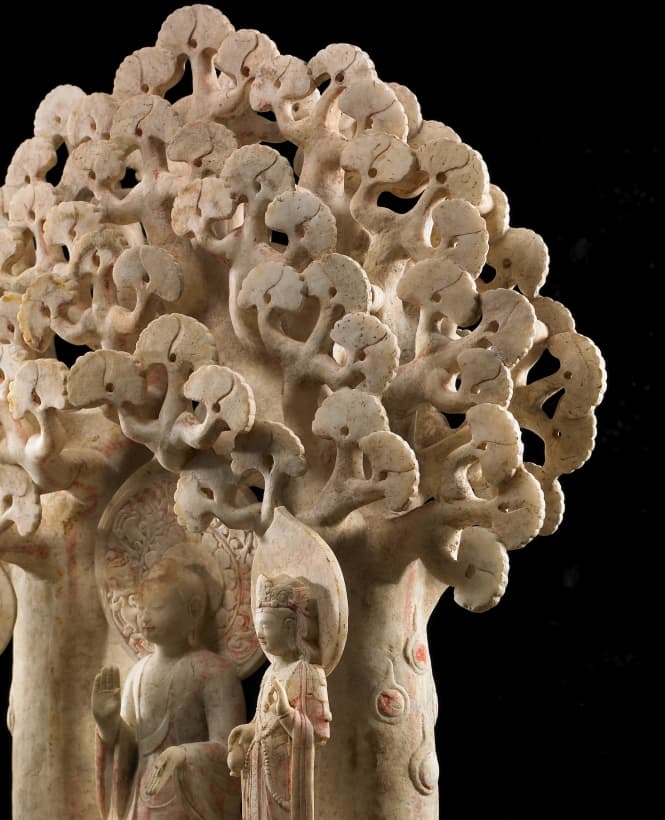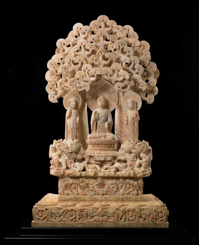 此尊像量體宏大,石質瑩潤,整體彩繪貼金,工藝卓絕。主尊佛像身軀修長,脅侍菩薩,持瓶擎蓮,立於雙樹之下,下刻雙龍,口啣蓮花,宛然生動,如佛宣教,儼然未散。六層透雕,象徵大乘菩薩六度之理,百八菩提葉,亦代表降伏眾生煩惱。後刻羅漢兩尊,呈現大小二乘,互為表裡。此尊北齊漢白玉三尊佛造像,為古代漢白玉造像的翹楚。