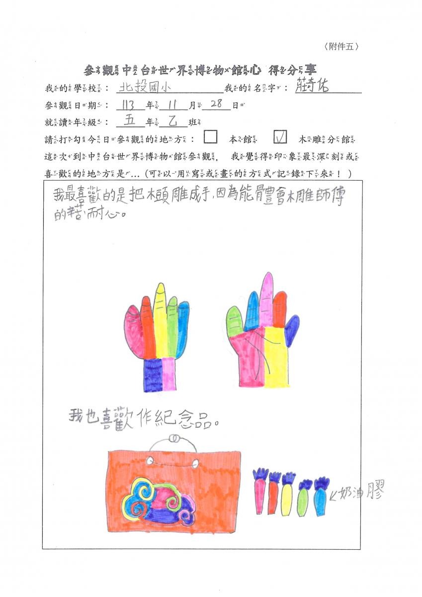 在木雕分館的工藝學習角,學生可以看到傳承百年的木雕工藝,看職人們如何用各種工具將木頭雕造成莊嚴的造像,再透過傳統髹漆與粉線、漆線工藝,替造像增添衣飾紋路。透過老師們的引導,學生們了解到每一項工藝製作的難度,更凸顯匠師們的職人精神,手作活動上,奶油膠的創作方式與粉線類似,因此教師們帶領學生進行奶油膠畫作,學生們體驗靜心創作的過程,藉此啟發孩子們能於任何事物上專注學習的態度。