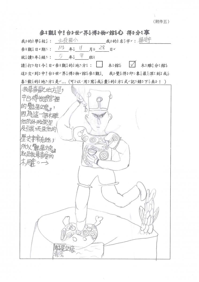2024年12月12日,中台世界博物館迎來魚池鄉東光國小師生們的參訪。至此,本學期博物館已接待來自南投縣的鯉魚、北投、鳳凰、東光四所小學的參訪團體。自107學年度推行「南投縣國民小學校外教學補助方案」,提供遊覽車車資補助,以及免費參觀門票與導覽機租用,致力於實踐創館以來「藝術化世」的宗旨,成為南投縣小學生校外教學的重要回憶。        館內的校外教學義工團隊自107年起,不斷精進並更新教學內容,透過生動活潑的方式,將博物館兩個館舍的文物及其背後的故事帶入孩子們的生活之中。參訪本館的學生不僅能認識漢字書體的演變、近距離欣賞名家書法作品,還能細品造像碑上的精緻圖案,從中發現這些文物與日常生活的緊密聯繫;在木雕分館,學生不僅從木雕工藝中學習到專注堅持的職人精神,也透過繪本導讀與分享進一步認識博物館的內涵。