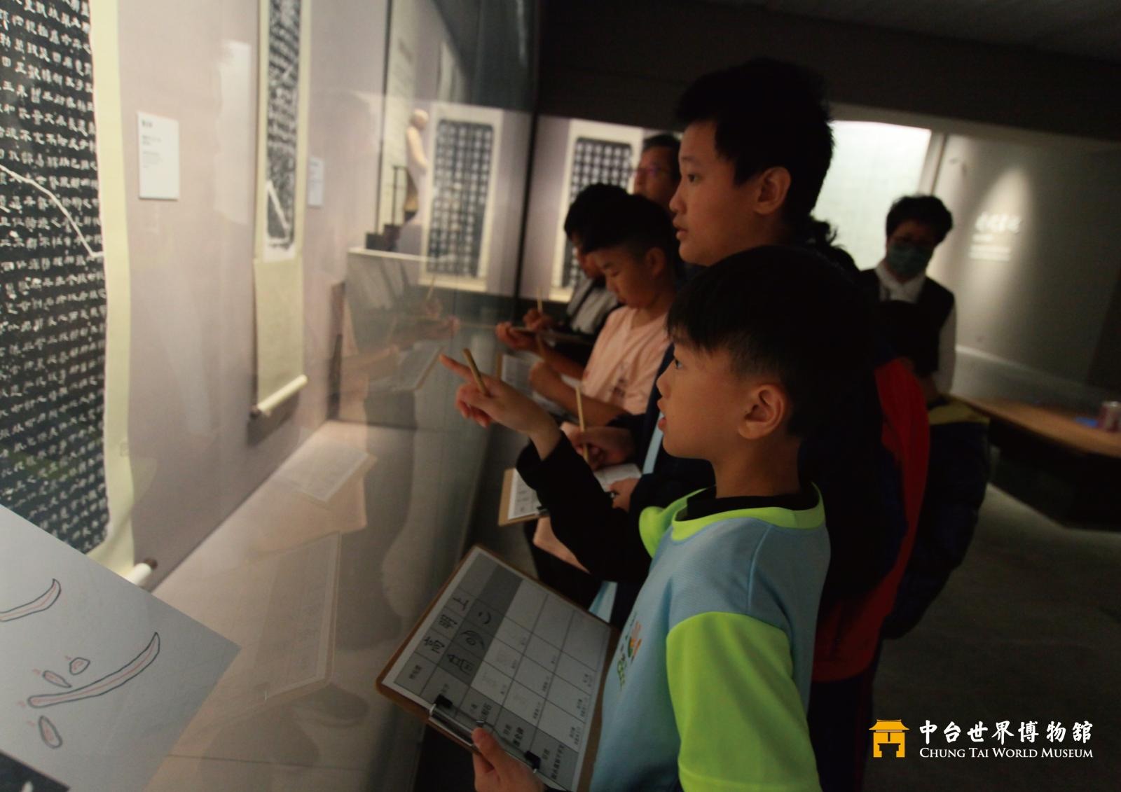進入本館書法展廳後,義工老師詳細講解篆、隸、草、楷、行五種漢字書體的特點與演變。接著,學生們再次展開觀察力挑戰:要在眾多書法作品中尋找指定的文字,並判斷其所屬的書體。既挑戰觀察力也考驗專注力,在義工老師的循循善誘下,要讓學生們也體驗看看,深入閱讀展件內容後有所獲的樂趣。