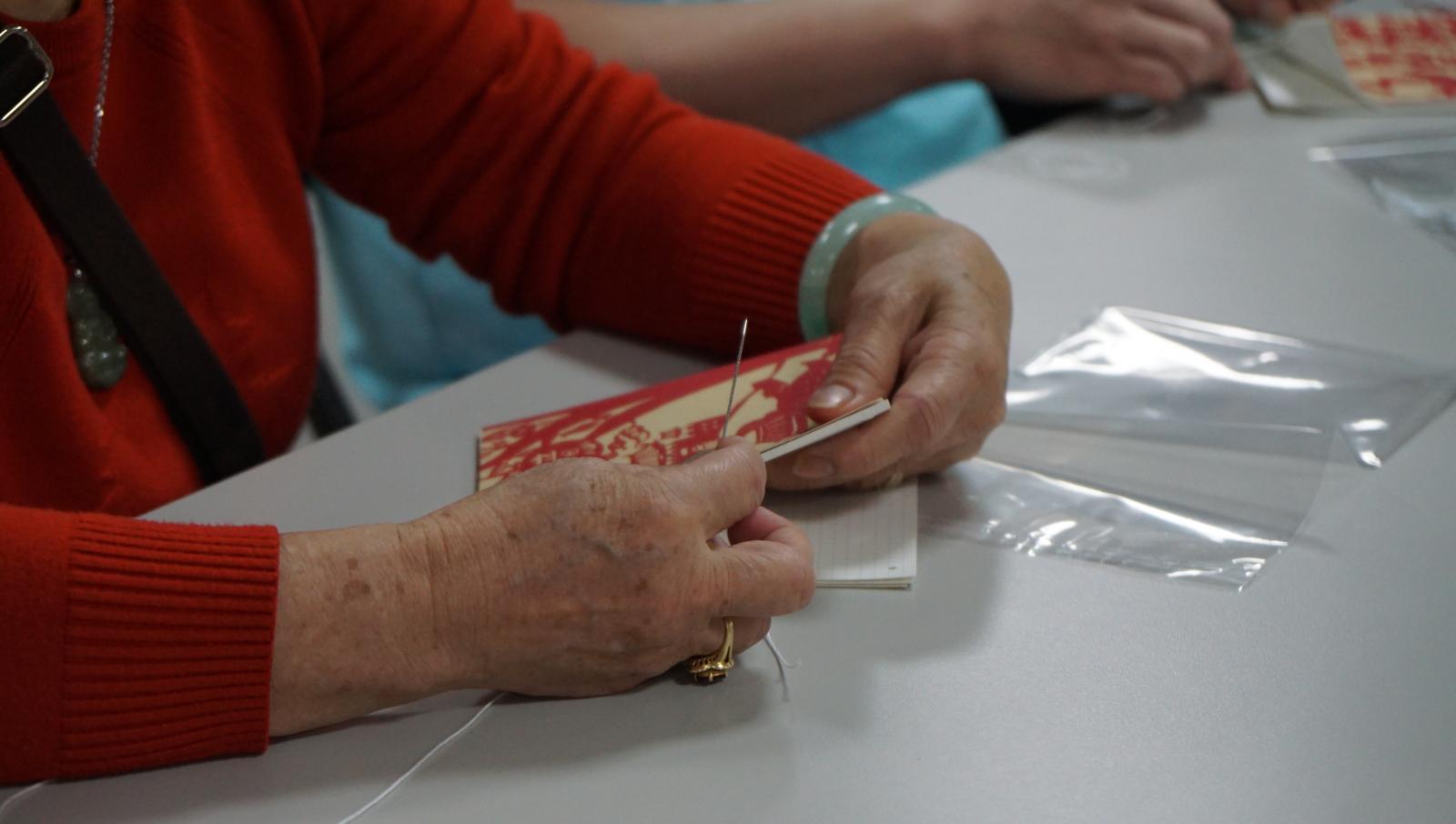 聽完了導覽,新春活動卻還沒結束,最後的手工線裝書考驗著大家的手藝與細心,精緻的線裝書在一針一線中慢慢成形,「原來第一針不用打結啊!」在家人的相互扶持下,小巧耐用的線裝書與滿滿的收穫同時被妥善收藏到袋子中,新春活動也在滿足的心情中正式步入尾聲。