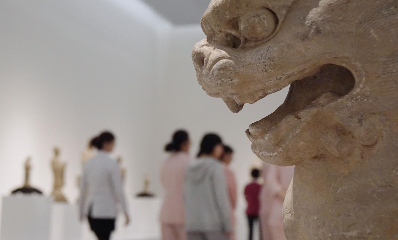 跟隨著導覽員的腳步,象徵著「事事如意」的獅子們映入眼簾,想不到在佛教造像中居然有這麼多的獅子,而在平時,獅子們的存在又常常被人給忽略,在展場中,石雕獅子形態活潑,有笑容可掬的獅子,有怒髮衝冠的獅子,有回頭叼著尾巴的小獅子,一路看來令人目不暇給。