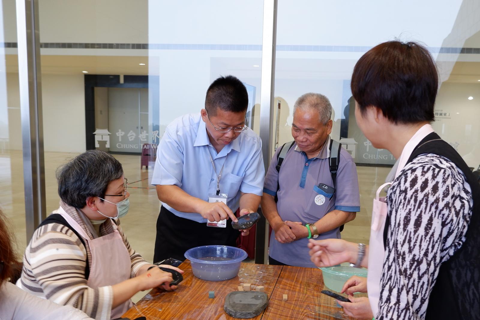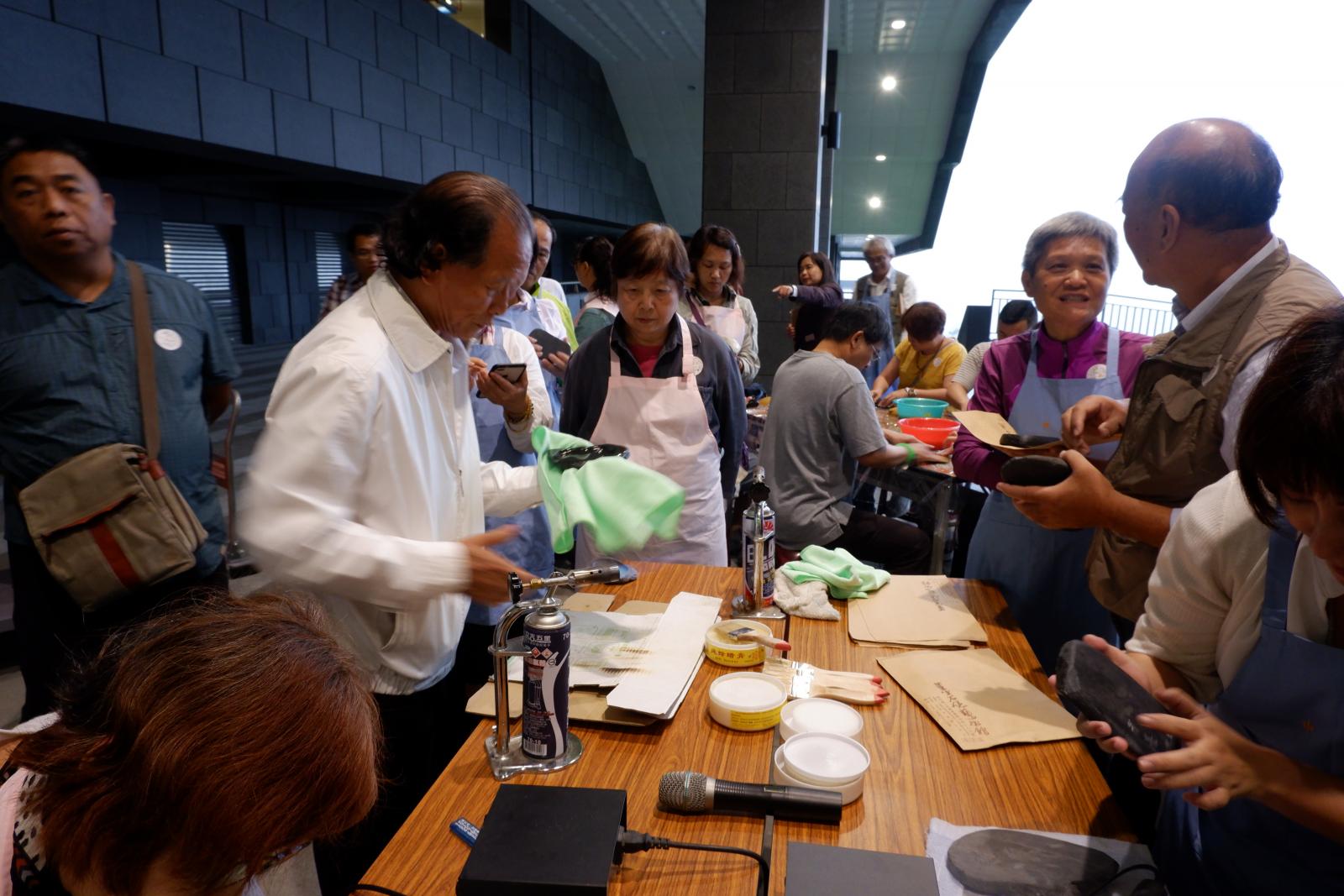這次活動吸引了一些初出接觸台灣硯文化的朋友,也有熱愛書法藝術的行家參與。自北中南各地風塵僕僕趕來的觀眾,一開場就以熱情與旺盛的求知慾點燃博物館雨天中的清冷。董坐石硯藝術館第三代傳人董嘉靖老師先向大眾概略介紹中華硯文化的歷史與螺溪硯 [*] 特色後,便帶大家開始進行硯台打磨體驗。