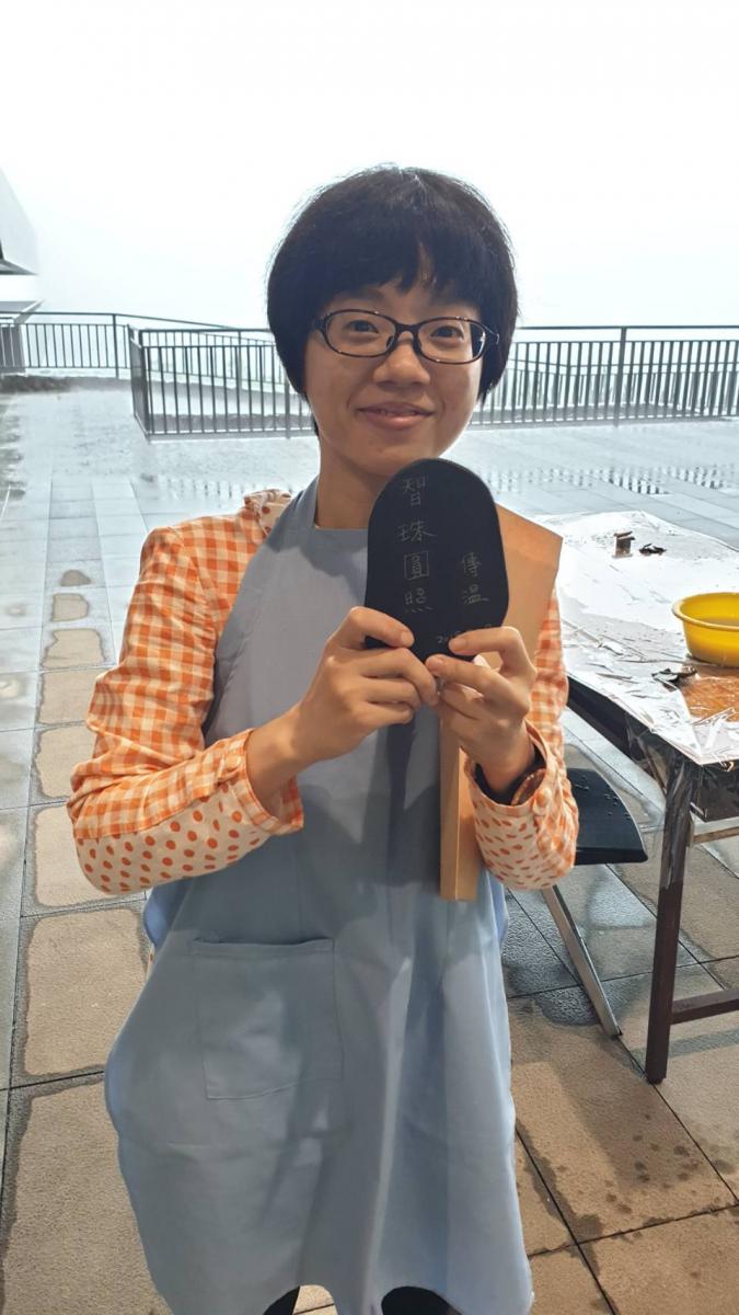 董坐老師(照片中著白色外套者)悉心幫大家磨好的硯台上蠟