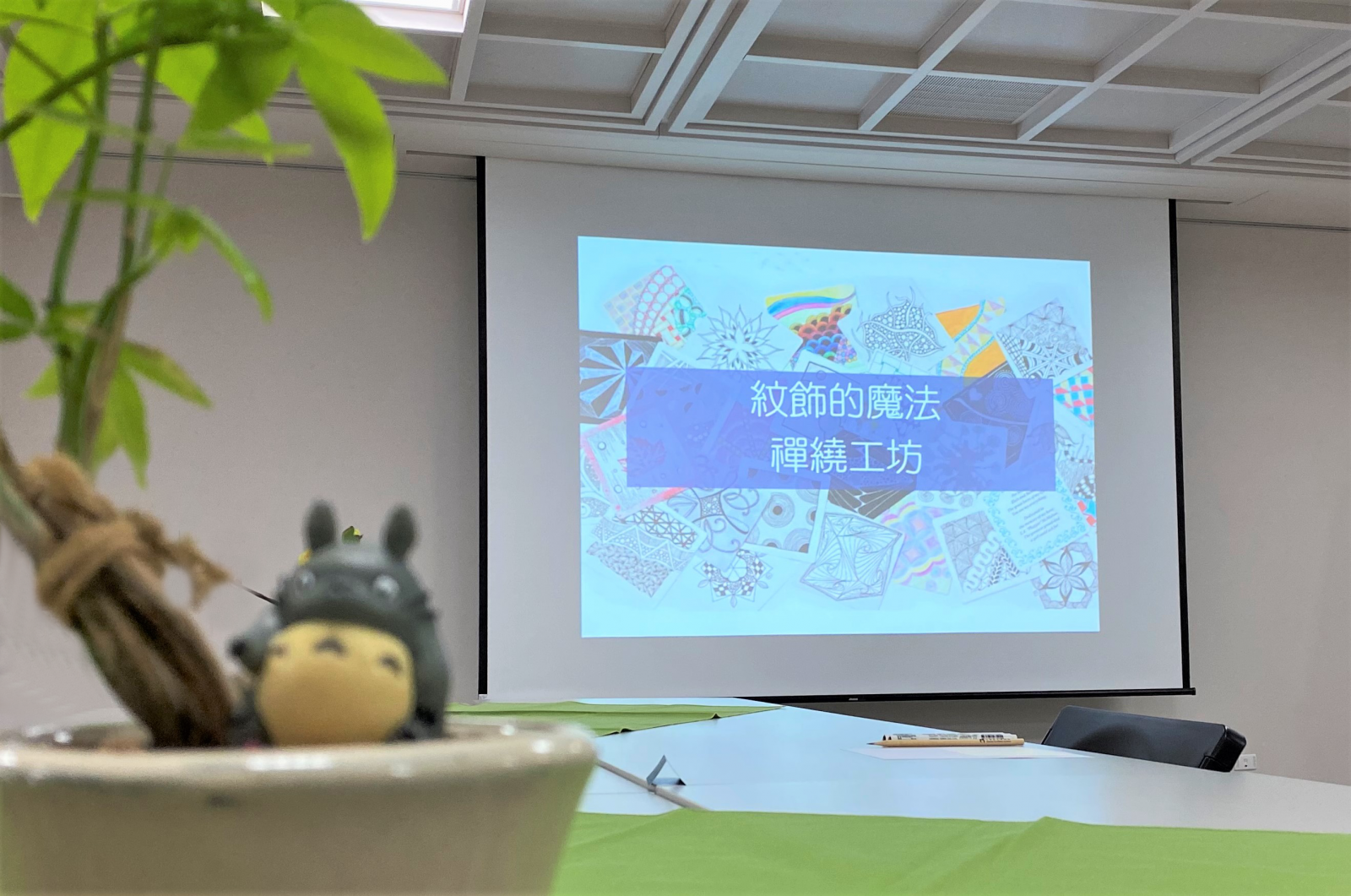 活動一開始,投影便浮現一幅幅的禪繞畫作品,看似複雜的線條,其實是由簡單的幾何圖形重複延伸繪製而成的。禪繞畫,是藉由一筆一畫的方式所構成的新藝術,從繪畫過程中找到平靜、放鬆的感覺,所以在創作的同時,心靈也達到了放鬆以及療癒的作用。