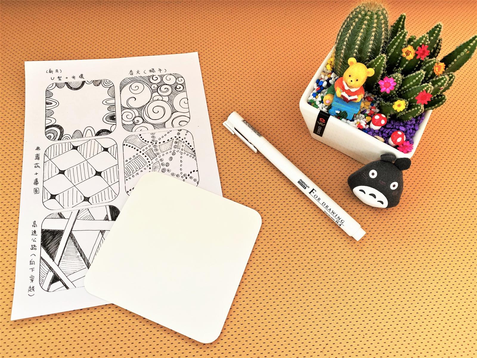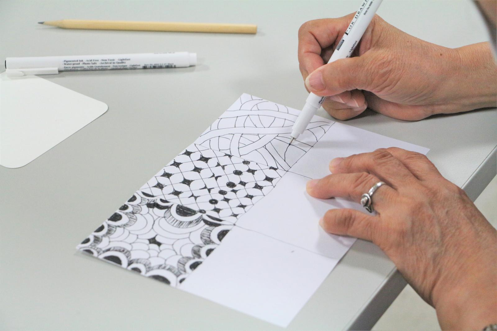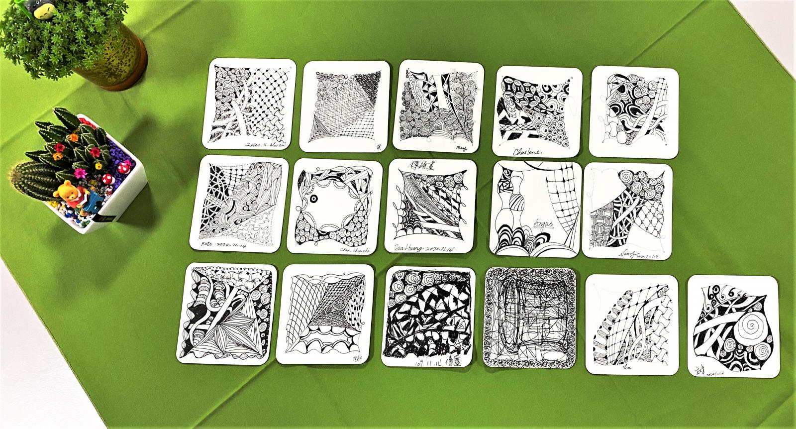 在沉靜的氛圍下,學員們各個心無旁鶩,享受在創作中。此時,一道細微驚呼聲傳入耳裡:「原來畫畫那麼簡單!」。看著桌上逐漸擺滿的作品,我們知道禪繞工坊已啟動了大家的藝術細胞。