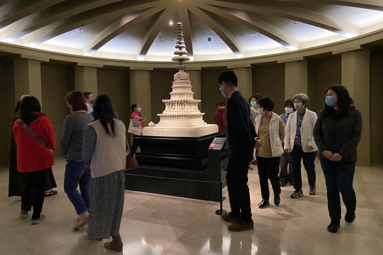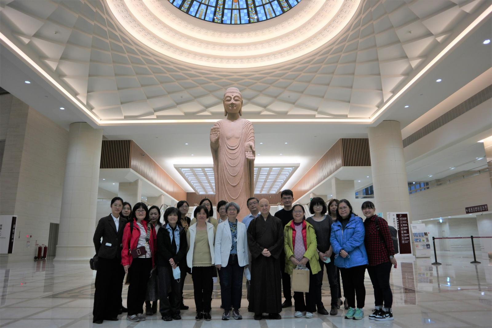 除了佛教造像、經典展廳,也參訪館藏書畫、當期特展「大悲普現」、古禪堂情境區等。巡禮過程中,故宮書畫文獻處的專家們,提供了關於展件寶貴的專業意見,對於中台世界博物館的展陳方式驚嘆連連,聚焦於展覽展務精彩討論分享,同時也邀請館長至故宮南院元月份舉辦之《法華經》相關展覽,最後在歡喜充實中圓滿此次交流。