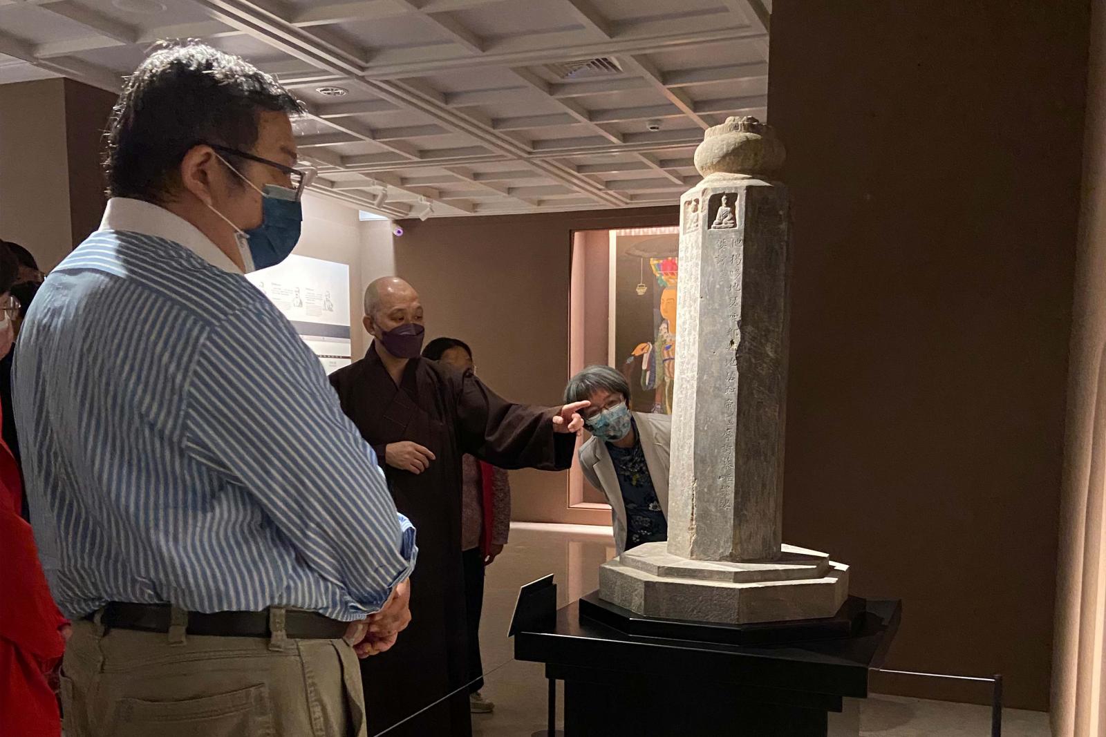 館長見諶法師介紹依福先寺西律院定本所造「佛頂尊勝陀羅尼經幢」。