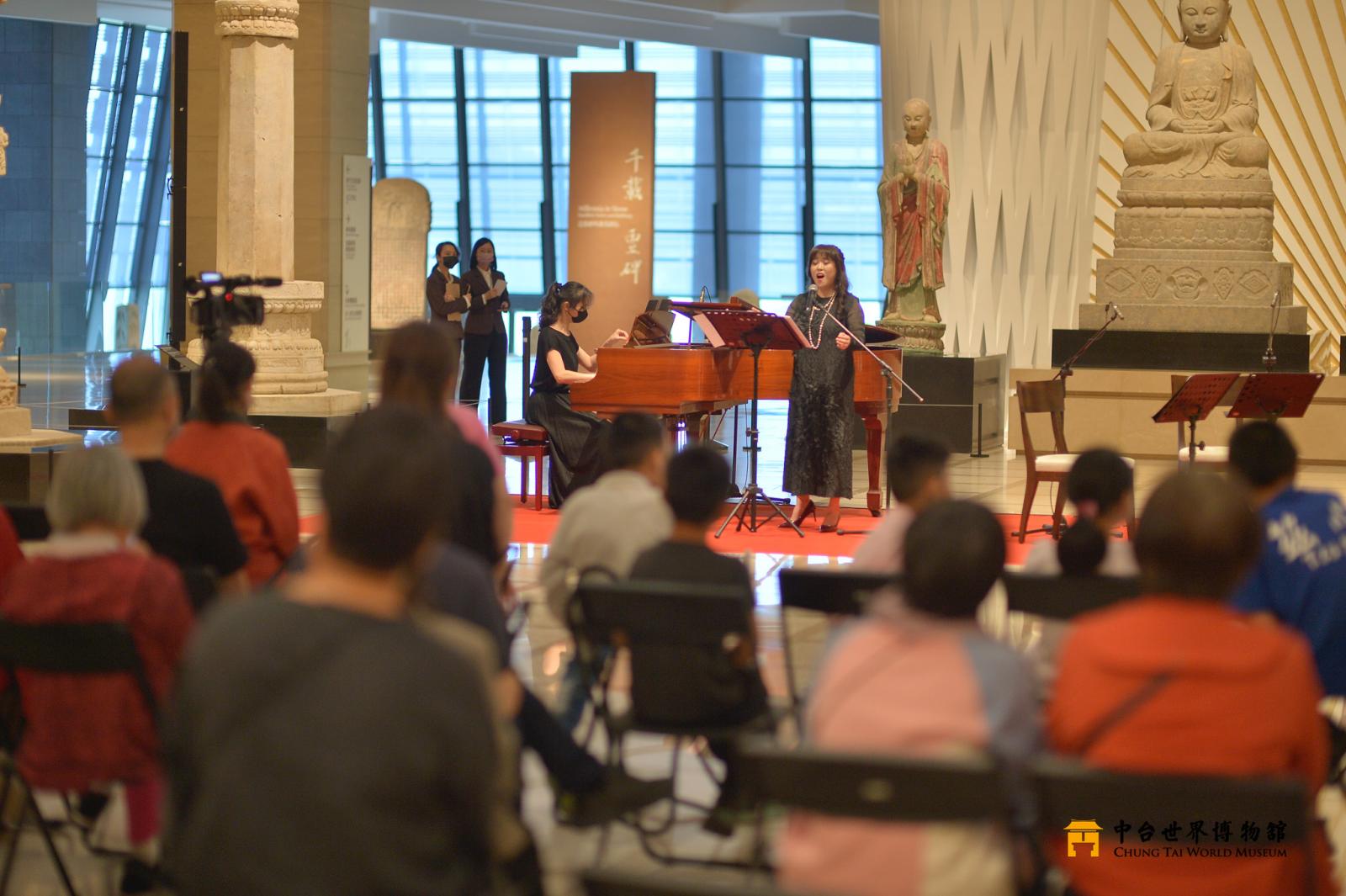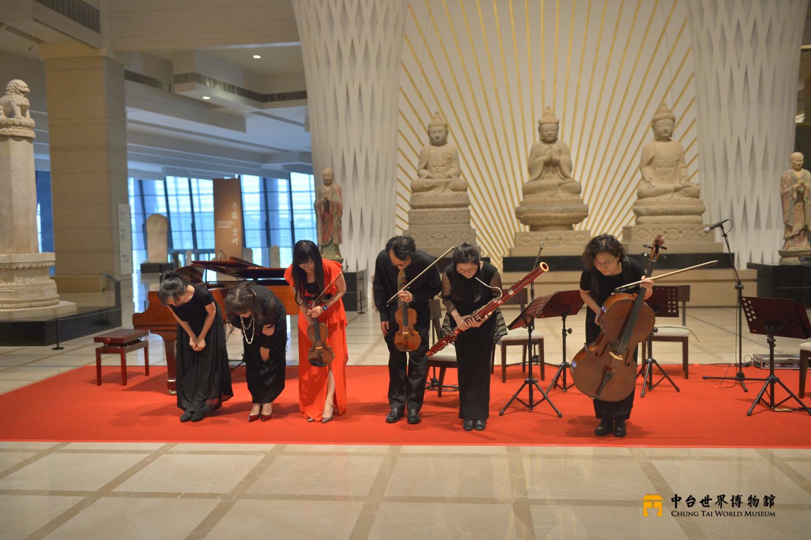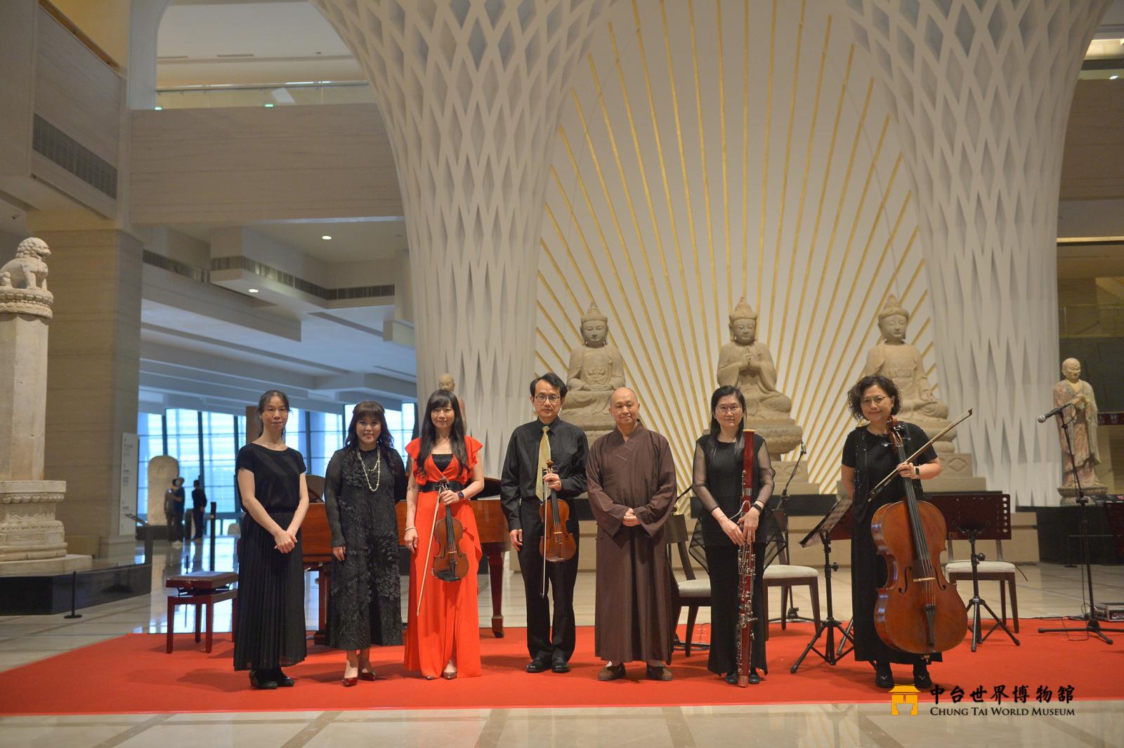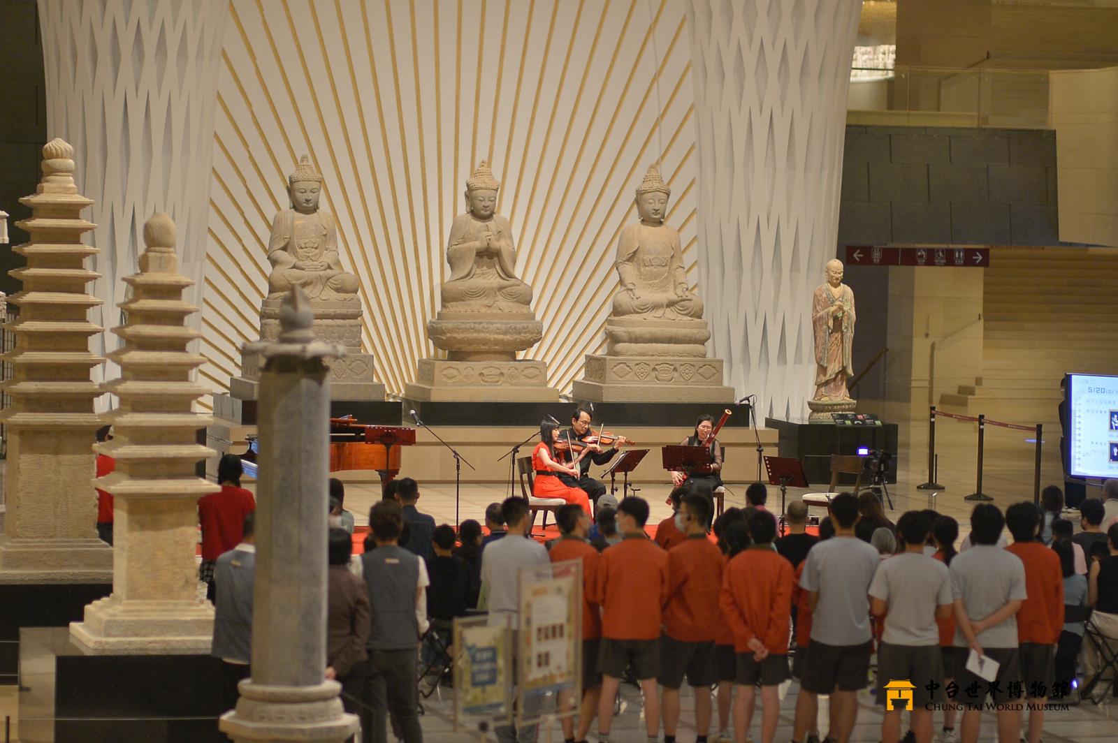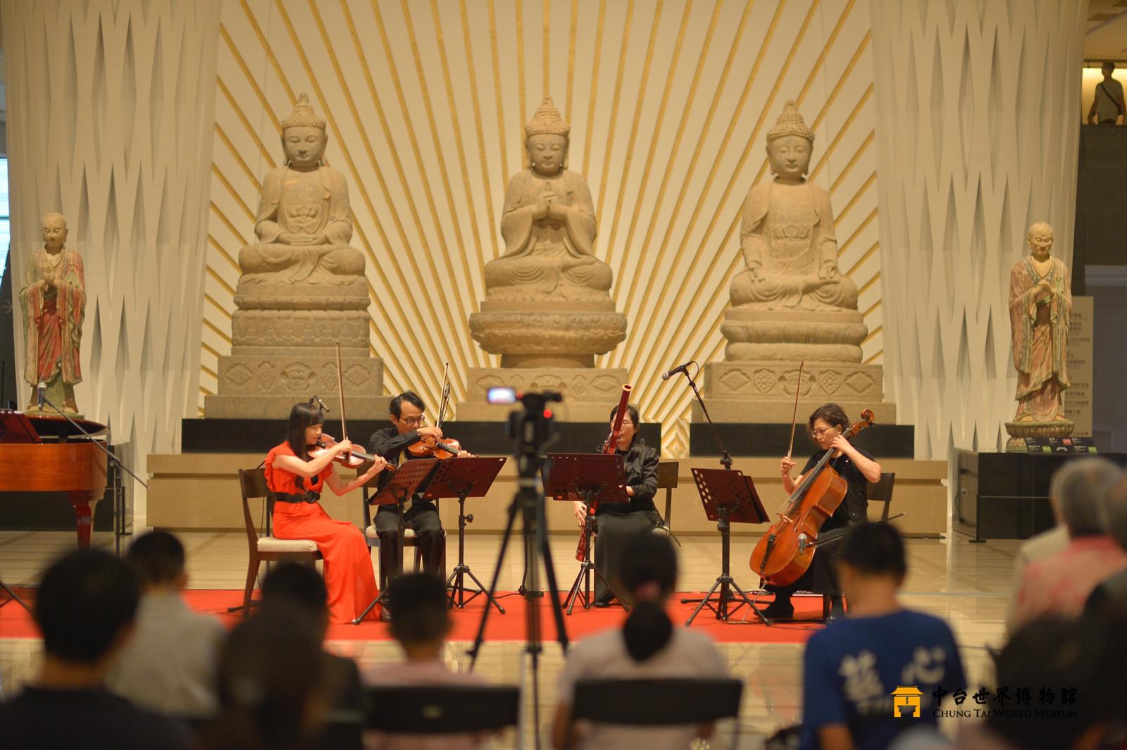 中台世界博物館為呼應 2023 年國際博物館日,規畫多元的藝文活動, 有 AR 集字展示、3 場《心經》主題導覽及樹下小型音樂會。讓觀眾在梅雨 紛紛的季節,走進博物館,也能擁有一整天豐富、精彩的藝文饗宴。 博物館經常給人莊嚴、寧靜的氛圍,本次活動特以音樂來妝點展廳, 邀請管弦四重奏:陳亮妃老師、陳怡達老師、李佩蓉老師、黃心怡老師、 臺灣女高音李語慈老師與鋼琴家侯千蒂老師,演奏休閒、輕快的曲目,讓 大家能夠在千年文物的環抱裡聆聽「心」世界,開啟博物館的新風貌。