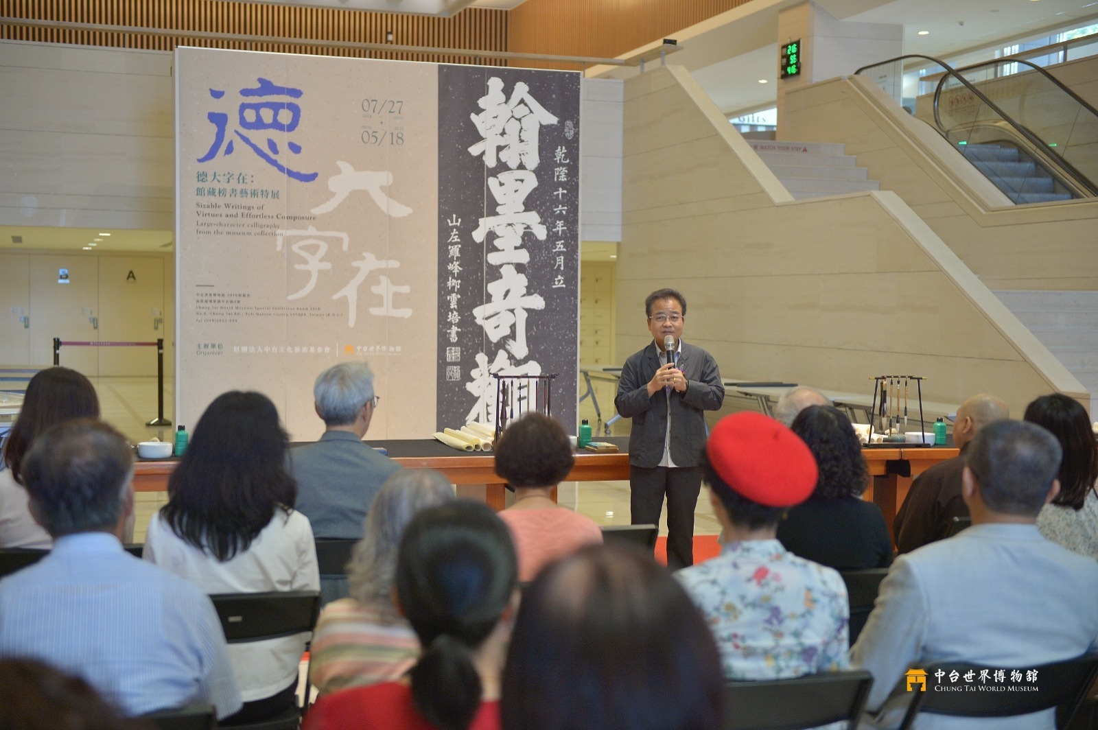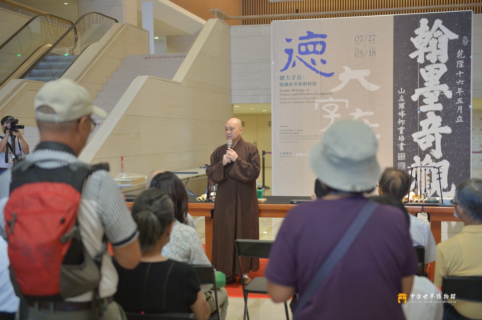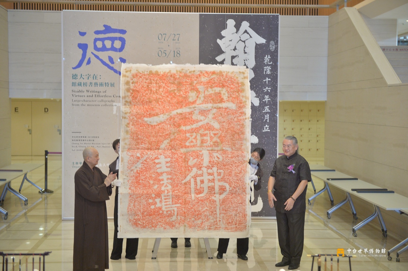 「德大字在」特展精選了西安碑林和府城謙受堂贈藏的石碑拓本,包括北朝山東佛教摩崖「大空王佛」原石拓本、西安碑林的「翰墨奇觀」及「寧靜致遠」等巨型碑刻作品。這些作品不僅富含文化意義,更展示了書法藝術的磅礡氣勢。南投縣文化局林榮森局長也藉此向大家分享自身書寫書法的心得及大字書寫的不易,並讚賞此次特展的殊勝。南投縣書法學會理事長曾惠楨校長亦分享自身臨摹古今字帖的心得,並讚嘆中台世界博物館保留許多難得的碑刻文物,讓如今的書法愛好者們也能得以一見這些好字。謙受堂的康益源先生,更有感於自身與博物館的因緣,藉由今日開幕儀式,再次致贈本館一幅摩崖大字「安樂佛」拓片,拓片高達2米,字體宏大、莊嚴,大氣非凡!而在這次特展開幕前遇颱風襲台,陰雨連綿多日,館長也在開幕致詞中引用清代孫星衍的聯句──「莫放春秋佳日過,最難風雨故人來。」表達能與貴賓、朋友們在雨後天晴的好時光中相逢,並感謝所有與會貴賓的蒞臨。