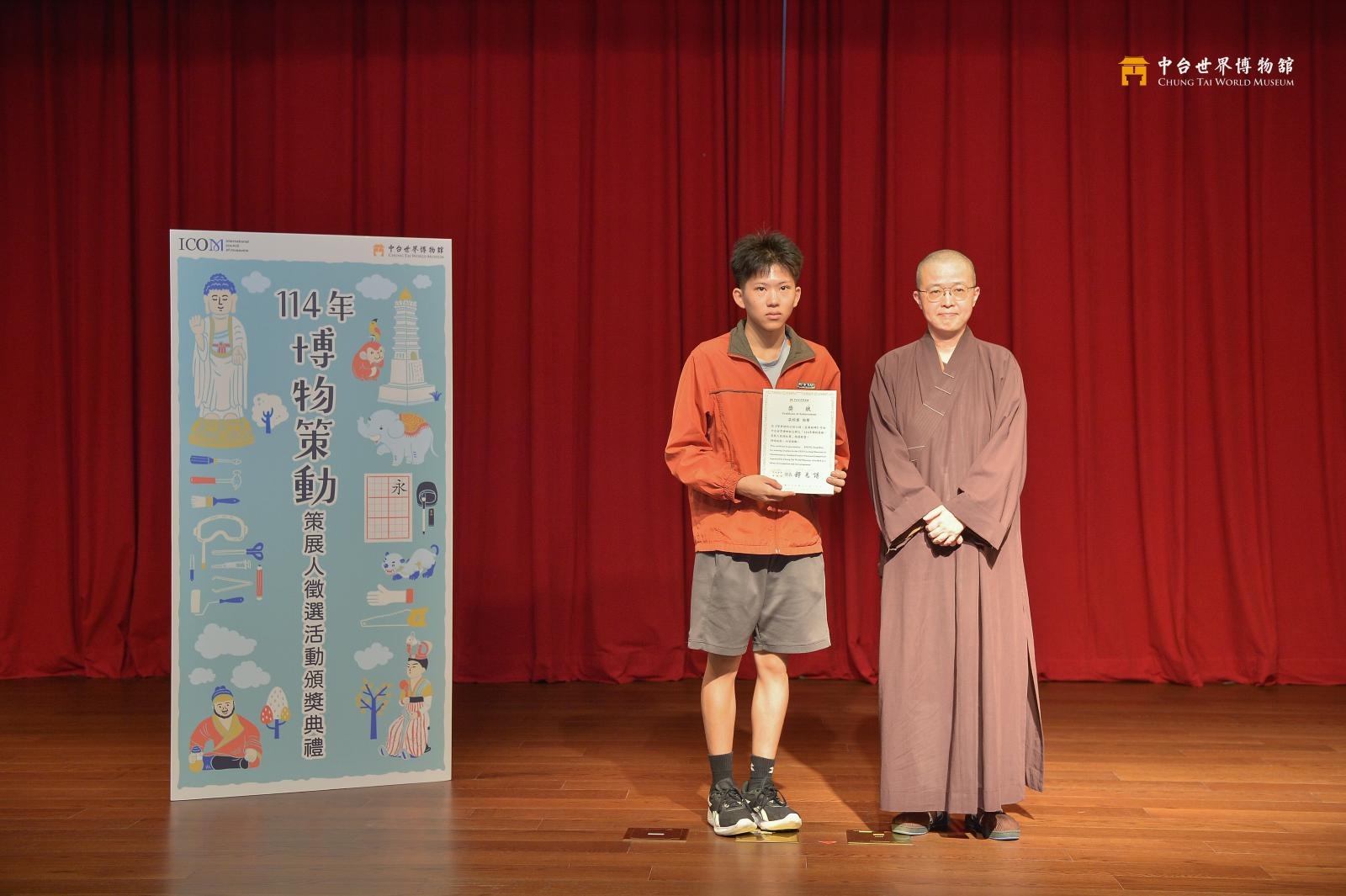 5月18日,中台世界博物館於重閣講堂舉行博物策動頒獎典禮。館長見諶法師在致詞時表示,國際博物館日是全球性的文化節日,鼓勵大家透過各種形式參與文化。而策展,正是一種讓博物館與社會、文化、觀眾產生連結的方式。學生從發想、考據、設計到主題轉譯,完成一次難得的策展體驗;也勉勵學生獎項只是形式,不論有無得獎,都是成長的一部分,持續努力才是關鍵。