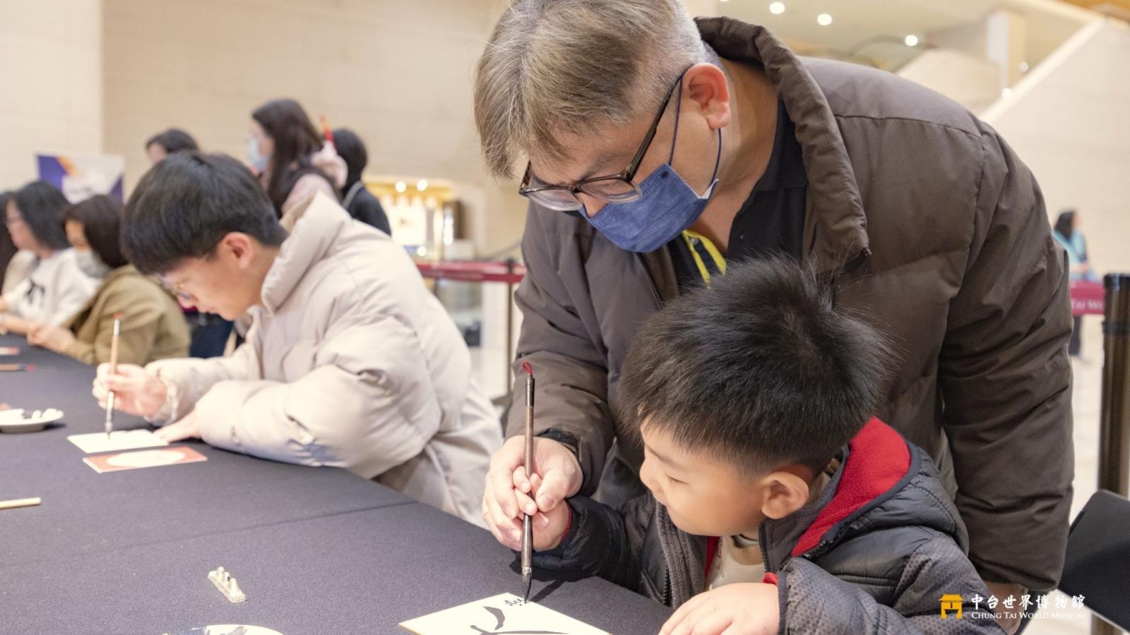 而年節期間要陪伴入館走春觀眾的是邁入第四個年頭的舞筆迎新活動,邀請入館觀眾一人書寫一個字,共同完成268個字的《心經》,並將觀眾書寫完成的作品集結展示於入口大廳,一起為新年的新氣象集氣祈福。活動現場除了蓄勢待發,專門練習毛筆字的義工要來大顯身手外;也有家長帶著小朋友再度前來參與活動;雖有往年的經驗,但時隔一年再度提起筆總能有不一樣的況味:有人潛心研究,只為寫好特定幾個字、也有人以奇制勝改以篆書揮毫,寫出吸睛的文字博得滿堂彩,而完成作品的那份喜悅,也將長伴觀眾心頭,歷久彌新。