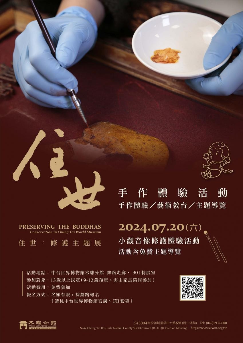 淺顯易懂的介紹了文物修護的重要觀念與趨勢,同時也邀請報名學員化身修護師,體驗修護小觀音像的過程,學員們小心的用竹籤捏塑斷指、接合等待固化後進行全色,在等待固化的時間,修護師帶領學員們前往301特展室,導覽本次特展文物受損到修護重生的過程。