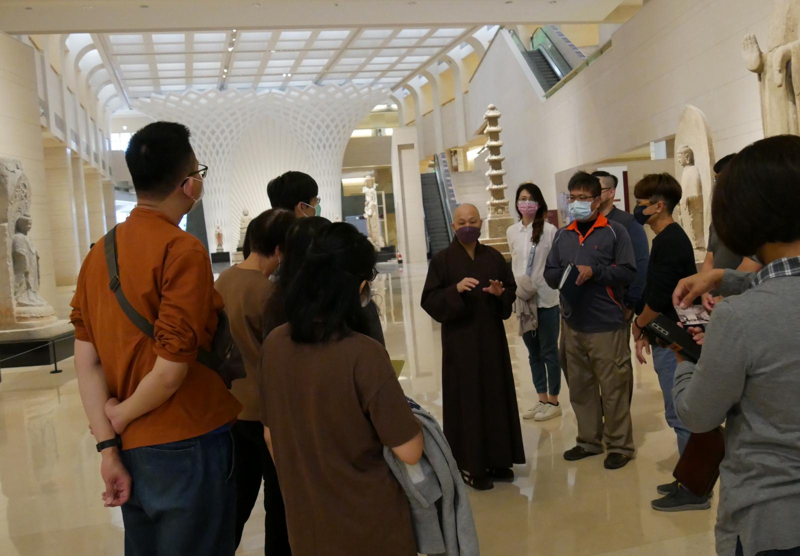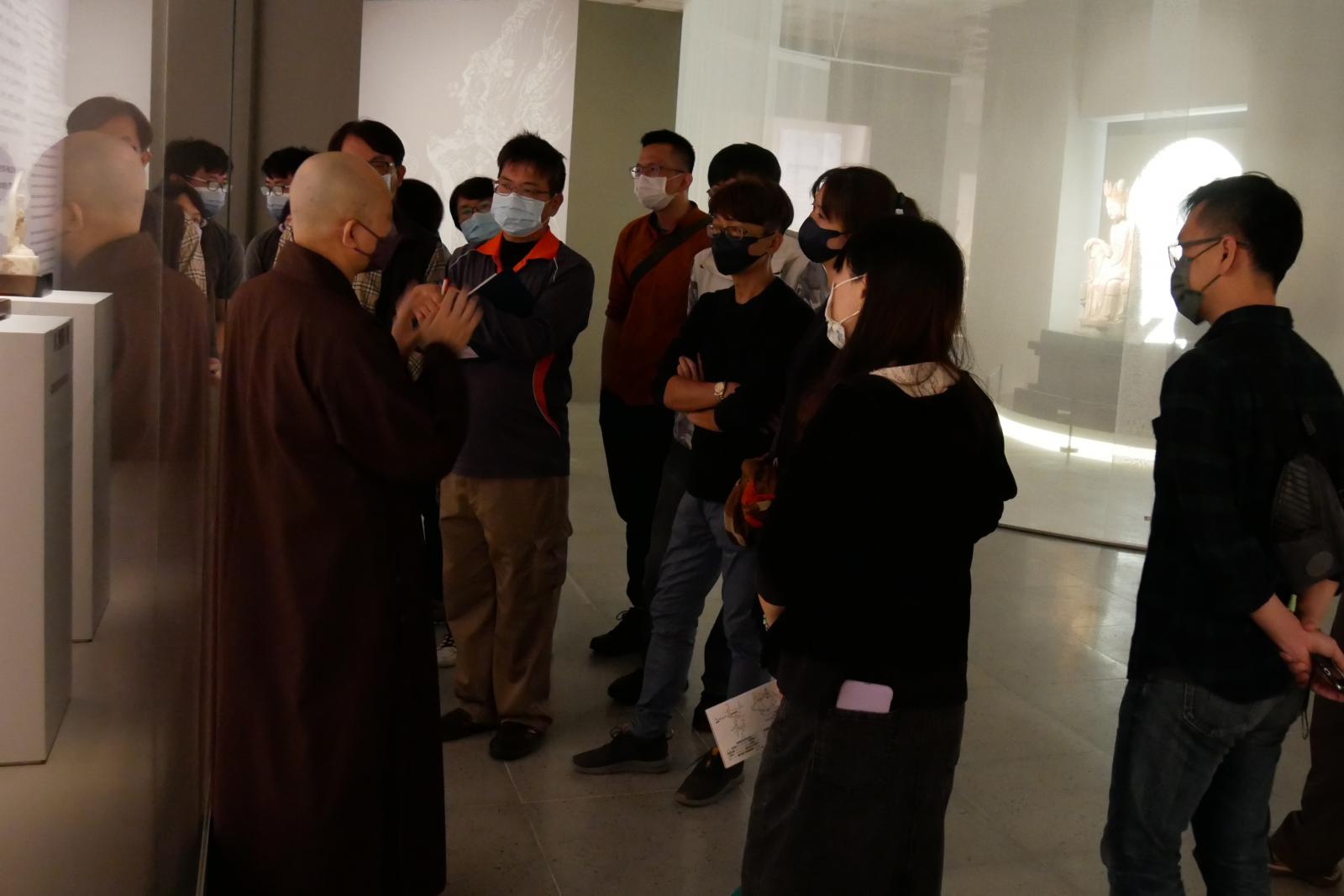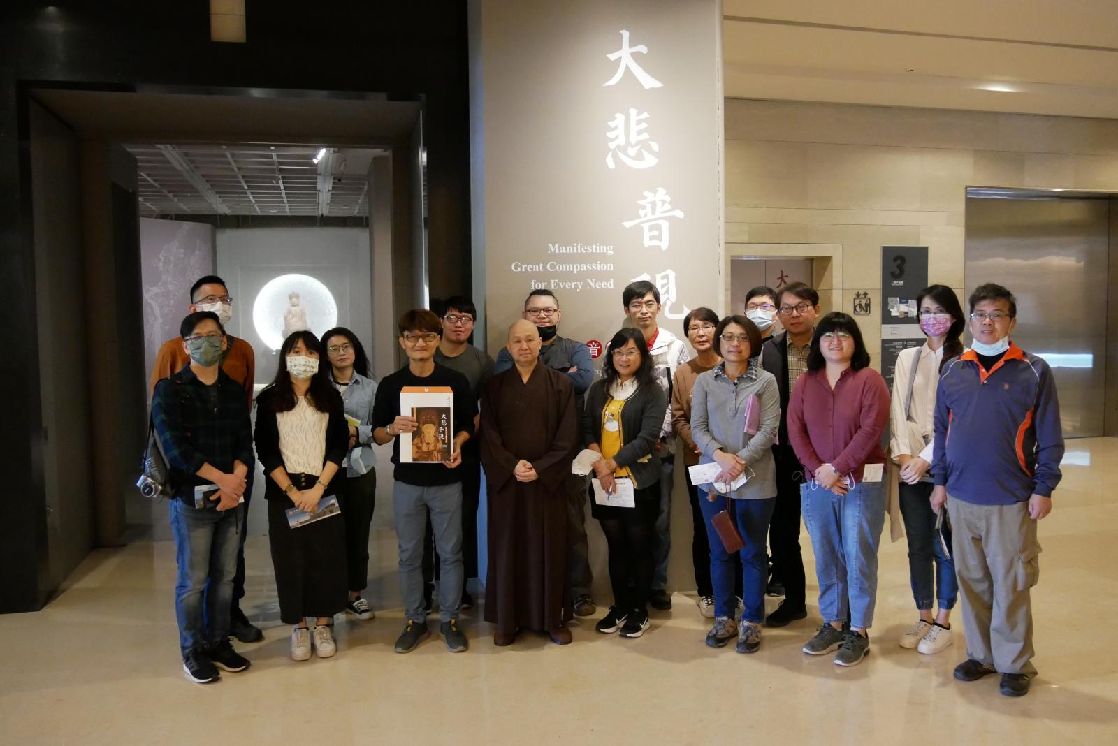 館長見諶法師為李教授師生一行導覽「大悲普現––館藏觀音造像特展」。在深度的賞導解說過程中,李教授也相互交流分享,觀音造像在民間宗教信仰的造像表現,並為大家講述木雕造像檢視木質、漆層分析的方法。同學們紛紛表示兩個小時的導覽,怎麼這麼快就到了,下次ㄧ定要再帶家人與朋友來參觀!