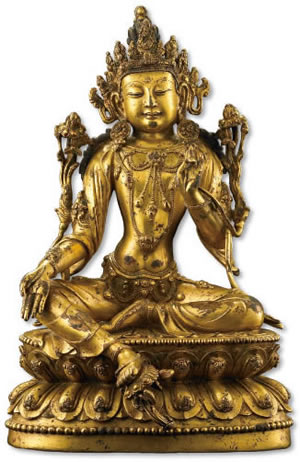 館藏明宣德年金銅觀音坐像,用失蠟法合鑄,表面鎏金處理,金質純厚。整體造形寬肩細腰、略成S形彎曲,雙手一上一下,各執長莖蓮花,一足結跏趺於台座上、一足下踏一莖仰蓮,通體華麗優美。菩薩頭戴花冠,冠上有化佛,紡錘形髮髻巍峨高聳,頂嵌圓形寶珠,兩條髮辮分垂於雙肩。兩耳側有緊縮之U字形翻卷束冠繒帶,兩耳各垂一大圓環耳飾。面相寬大,臉頰豐腴,眉眼較長,神態沉靜,略帶微笑。上身坦露搭帔帛,帔帛順肩繞臂而出,富有立體動感。胸前及腰間配帶華麗的U字形連珠瓔珞,全身搭配手鐲、臂釧和足釧等飾物,繁縟精美。下著薄裙貼體,小腿部衣紋密集,衣褶起伏流暢自然。