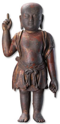 明清時期工藝美術的發展迅速,拓展了佛像藝術的創作範圍。館藏明代木造誕生佛立像,一手指天、一手指地,佛身斑剝的歷史氣息,生動傳神的眼神雕刻,天真無邪的純真展現,是佛誕浴佛法會之太子佛原型。