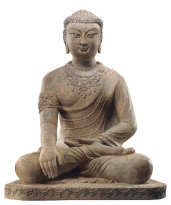 此佛座像,螺髻,頸有三道紋,結跏趺坐,右足居上,左手斂、仰掌、橫置腹前,作禪定印;右手垂、撫膝、指尖下垂,作觸地印(降魔印)。頸佩項圈,瓔珞莊嚴,胸飾華麗,結帶繫於頸後;右臂飾臂釧,典雅華貴。袒右肩袈裟、薄衣貼體,瓔珞紋飾、雕刻精美,略帶印度後笈多王朝至帕拉王朝(Pala Empire)的密教造像風貌。