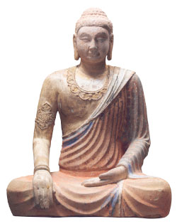 此尊像螺髻、無冠,面相方圓,睜目高眉,雍容端嚴,闊胸束腰,偏袒右肩,披金帶彩。彩繪梵式袈裟,主色赤,配青色,衣褶層疊規整,稜紋銳起流暢,披肩褶紋搭至左肩後。項圈嚴飾瓔珞,殘金猶在,琳瑯尊貴。左手施定印,右臂垂手撫衣,作觸地印。臂釧精緻,環鐲腕釧。原底座已佚,造像風格似四川廣元千佛崖的菩提瑞像。