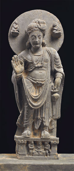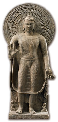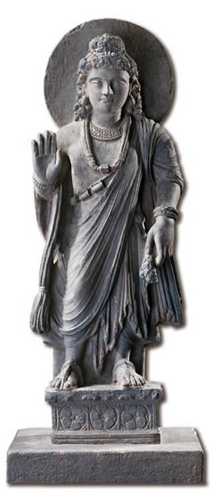 西元一世紀前後,印度因大乘佛教的興起,出現了佛陀的造像和菩薩像。貴霜王朝(Kushan Empire,西元一至三世紀),誕生了兩大藝術中心──西北部的「犍陀羅」和恆河中上游地區的「秣菟羅」,兩地同時期有佛教造像,但藝術風格卻迥然不同。犍陀羅造像靜謐內斂,展現印度希臘化的睿智與寫實風格;秣菟羅造像穩健有力,顯現印度本土化的活力與古典樣貌。