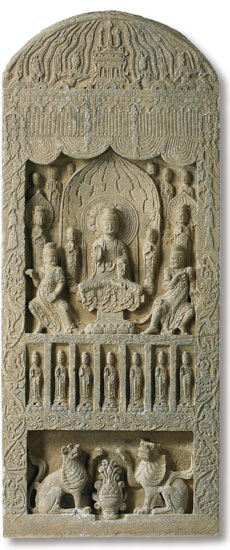 主尊左右有成對的隨眾造像,二弟子、二脅侍菩薩、二力士,加上光背兩側六身佛弟子,方形主龕一鋪十三身,造像人物雖多,卻主次分明、參差有序。碑陽主龕下方為七尊立佛,最下方為二隻獅子,中央有後代雕刻的博山爐。