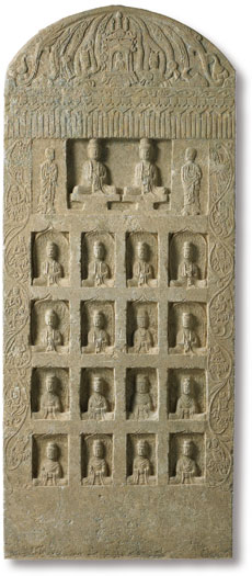 碑陽方形主龕,頂篷裝飾懸垂帷帳、穗纓、鈴鐸等寶飾紋樣,帳形龕楣下端仿布質帷帳樣式、帷幕弧形狀拉開之幕布,中層又疊加垂直的天幕紋、其回復紋樣表現出布質垂縵的重疊效果,上端再加上倒三角形流蘇紋垂帳的裝飾,整體帷帳顯得富麗堂皇。