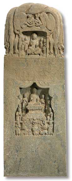 一、碑陽主龕是「釋迦如來說法」龕,一佛二弟子二菩薩,二供養人胡跪請供、二僧俗誦經持爐、二胡服護法儀仗威武,共一鋪十一身造像。雙獅前引、象馱寶輦,錦飾麗紋、雕瑩華座、華蓋嚴淨,儼然一幅靈山法會圖。《妙法蓮華經.序品第一》記載:「爾時世尊,四眾圍繞,供養、恭敬、尊重、讚歎。為諸菩薩說大乘經,名無量義,教菩薩法,佛所護念。」