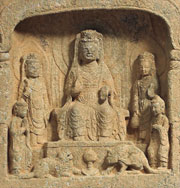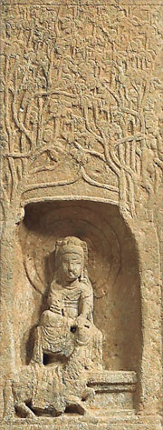 三、背龕是「善跏趺倚坐菩薩」龕,主尊菩薩端坐於座上,雙腳自然下垂,意指當來下生彌勒尊佛。依據《佛說彌勒下生經》記載,蠰佉王時代「彌勒菩薩於兜率天觀察父母不老不少,便降神下應從右脅生……名曰彌勒。彌勒菩薩有三十二相八十種好……爾時去翅頭城不遠有道樹,名曰龍花,高一由旬廣五百步,時彌勒菩薩坐彼樹下成無上道果。」