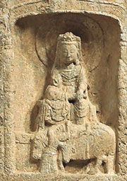 四、左碑側是「思惟太子」龕,半跏思惟菩薩通常是右腿搭於左腿、右手支頤的形式,表現釋迦牟尼佛成佛前,悉達多太子沉思解脫生老病死苦之形象,與面前的愛馬告別的情景。