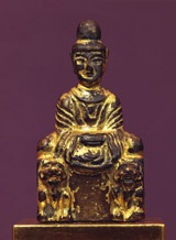 「五胡十六國」(304-439)時期,是指自西晉末年到北魏統一北方期間。北方盛行坐禪,銅佛造像中禪定坐像較多,作為行者禪觀或供養禮拜。現存十六國禪定坐像多為小型銅佛造像,形體較小而精緻,如館藏五胡十六國的「佛坐像」(圖二),肉髻高聳,大眼橫長,雙手交疊豎於腹前,禪定印刻劃簡括。身著圓領通肩式袈裟,U形衣紋形式,佛結跏趺坐於方座,座前鑄浮雕雙獅,造型簡練拙趣,臺座與像合鑄而成。從磨光肉髻、通肩大衣、U形衣飾、禪定印相、雙獅底座等,顯現十六國時期典型的金銅造像特徵。
