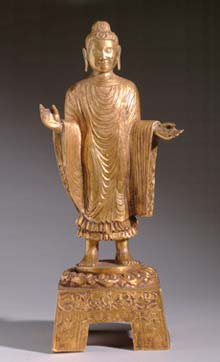 但是我們如果從另一個角度來觀察,這些造像特徵在相貌、身形姿態上又不同於印度佛像的既成模式,反而向中國的神仙造形中「人化」的樸素造形轉變。以審美功能來說,這些考古文物與文獻記載體現了外來宗教觀念的影響,也改變了中土對神道設教的傳統。從普遍在意義上來看,初期佛教造形是與中國的神仙夾雜在一起的裝飾圖騰,並沒有把佛本身當作獨立供奉的崇敬對象。在中土承襲了漢代重「紋」的裝飾性審美風尚,從而可知,佛像題材的表現採用任何各種可能的展現方式,化入墓室的雕刻、金銅的帶飾、陶瓷上的貼塑、石壁上的線刻及門樑上的圖像,與人的生活與生命結合在一起。