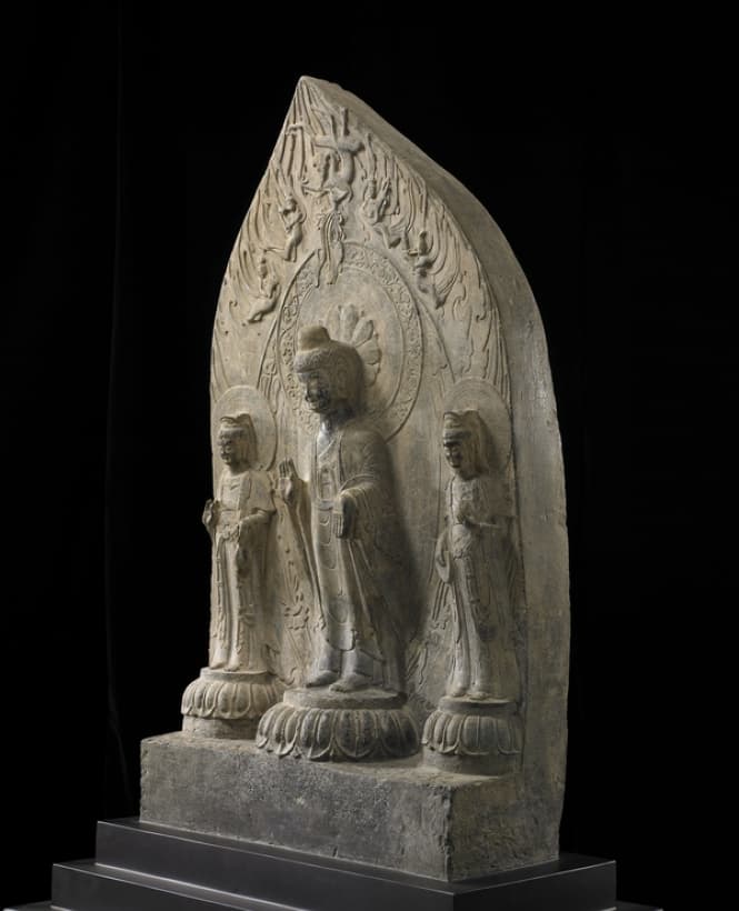 此鋪背屏式高浮雕三尊像。主尊螺旋紋高髪髻,面相清秀,微含笑意。身著褒衣博帶式袈裟,內有僧祇支,中間結帶,手施無畏、與願印,跣足立於蓮台之上。二脅侍菩薩頂戴寶冠,寶繒垂肩,衣著帔帛,左右各持蓮苞、淨瓶及桃形鎖,瓔珞帛帶在腹前結成 X 形。此尊造像之背屏式一鋪三身像具體呈現出山東青州地區的造像風格,既雄偉磅礡又細密入微。