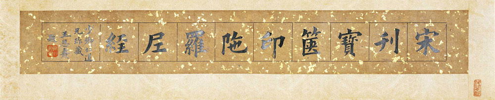 With the development of block printing in the Five Dynasties (907-960), block printing edition sutras became the mainstream and handwritten edition sutras began to fade out, making them precious historical commodities. This exhibit showcases two of these precious pieces: the scroll of the late Tang to Five Dynasties (836-960), 17-meters long, Chapter twenty-five of The Buddha's Name Sutra written in black-ink, and the hand transcribed Lotus Sutra in silver ink on dark blue paper. Both are outstanding examples of hand transcribed sutras from Jiangnan, the southern part of the Yangtze Delta. Also featured in this exhibit is the block printing edition of The Precious Chest Seal Dharani Sutra of the Whole Body Relics Concealed in All Buddhas’ Minds in the period of King Qian Chu. The excellent quality of the ink and scroll paper, and the fine printing demonstrated the cutting-edge state of Wuyue block printing technology.