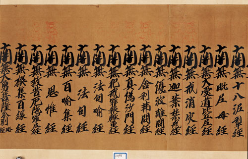 This sutra scroll was handwritten in black ink in the calligraphy style of regular script. The beginning of the scroll is the text of Vows, the end of the scroll is the text of Repentance, and the main body is the text of Chapter Twenty-Five of Buddhas' Names Sutra. At the head of each citation of the Buddha’s name, there is a sealed scarlet image of a sitting Buddha, with a total of 322 Buddha images. Above the title of the sutra, there are 26 sealed scarlet images of pagodas. The whole scroll is composed of 19 manuscripts pasted together. It contains a total of 523 lines. The precursor of block printing was rubbing and stamp production technology. The stamped prints of Buddha and pagodas on this sutra provided a prototype for the future invention of movable type printing in the Northern Song period (960-1279).