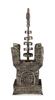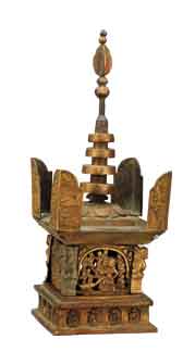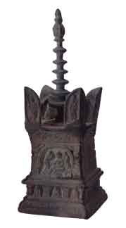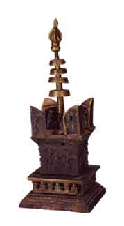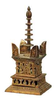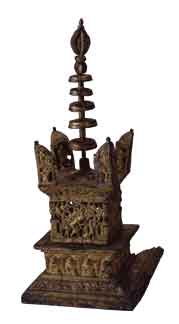 Much like the young King Ashoka, the young Qian Chu (929-988) in his early years also embarked on military expeditions that killed many thousands lives. Aware of the serious consequence of his destructive actions, his mind could no longer experience any peace and tranquility, and he became physically sick. He decided to repent for his past conduct in hope that it would recover his health and peace of mind. Inspired by King Ashoka’s devotion to the Buddha, he also pledged to create countless pagodas all over the land. They were miniature pagodas made of metal, which also came to be known as “Ashoka Pagodas.” They were built specifically to store scrolls of Buddhist sutras or bury relics. Ashoka Pagodas are known by two other names: one is “Precious Chest Seal (Sutra) Pagodas,” named for two reasons: (1) they are shaped like a precious chest, and they house sutra; (2) they are enshrined with the sutra The Precious Chest Seal Dharani Sutra of the Whole Body Relics Concealed in All Buddhas’ Minds. The other name is “Gilt Pagodas” because most of them are gilded on the surface.