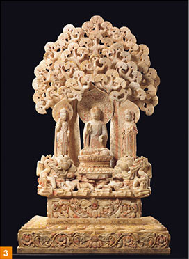 有意思的是,这样的现象在南方则不然。银杏虽然极早就出现在南朝的绘画之中,并被广泛运用于山林绘画和墓葬艺术中,但在南朝佛教艺术上却相对少见。1 就目前已知出土的众多南朝造像中,所出现的树木大多为点状式叶片(图1、2),于叶片细节刻划不明显,不似北朝的银杏叶式圣树清楚刻划出叶脉及叶片叠压的前后关系,由此显示了南北朝在圣树图像的选择上可能有所不同。