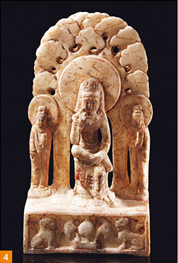 随着时间的发展,银杏叶式圣树到了东魏、北齐愈发流行,大致以洛阳、邺城为中心,同时向周边地区扩散影响,范围东至山东,西至山西、陕西,分布地域极为广泛。2尤其是河北地区,佛教造像中的树木几乎都以银杏叶式圣树来刻划,不论是世尊说法场景中的菩提树(图3),或是思惟菩萨像的龙华双树(图4),银杏叶式圣树俨然已成为河北地区佛教圣树的典型图像。